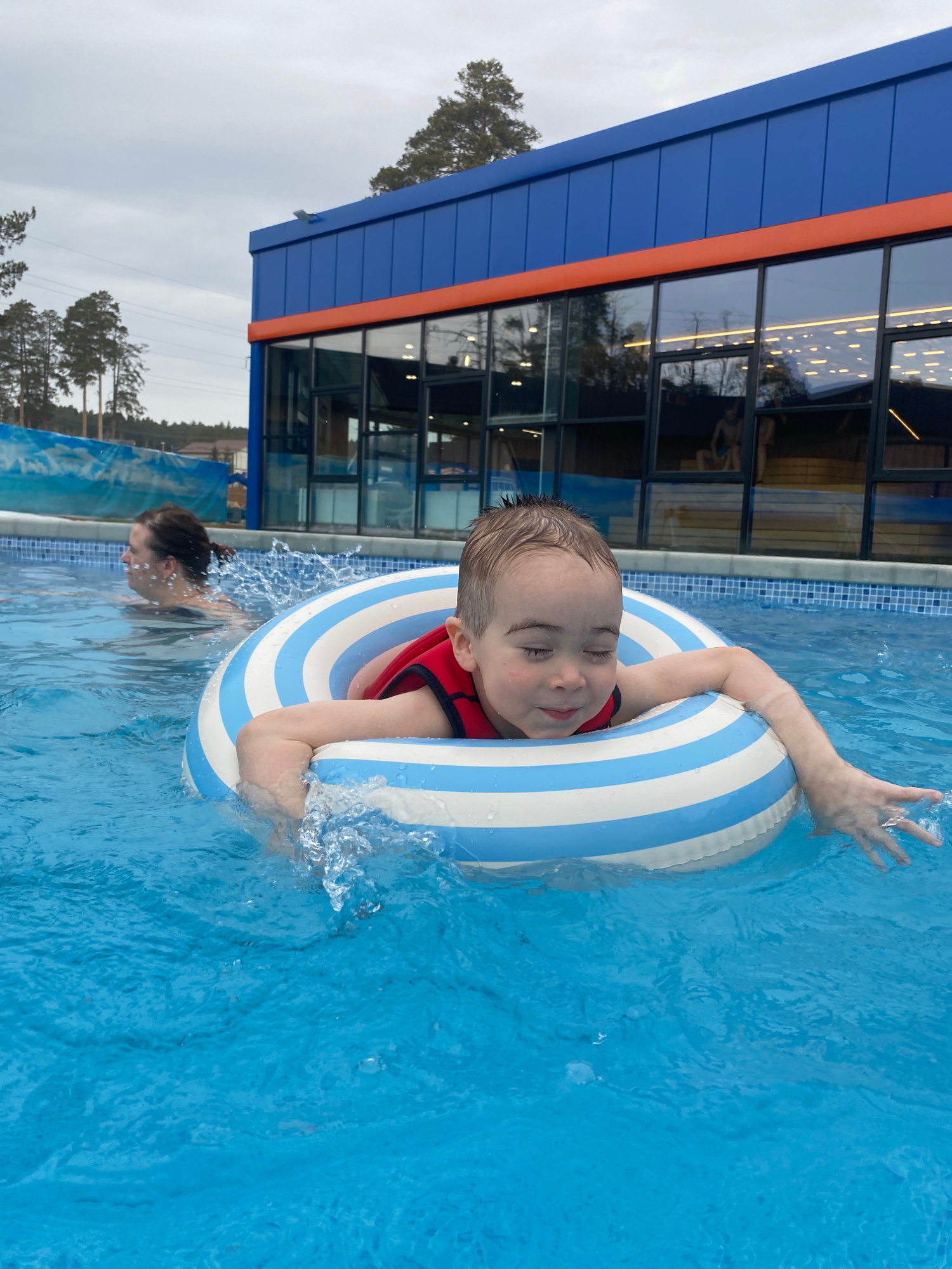 An outdoor swimming pool scene in the city of Votkinsk, Russia, is depicted on an overcast day. In the foreground, a young male child, with wet light brown hair, floats in a white and light blue horizβ¦read more