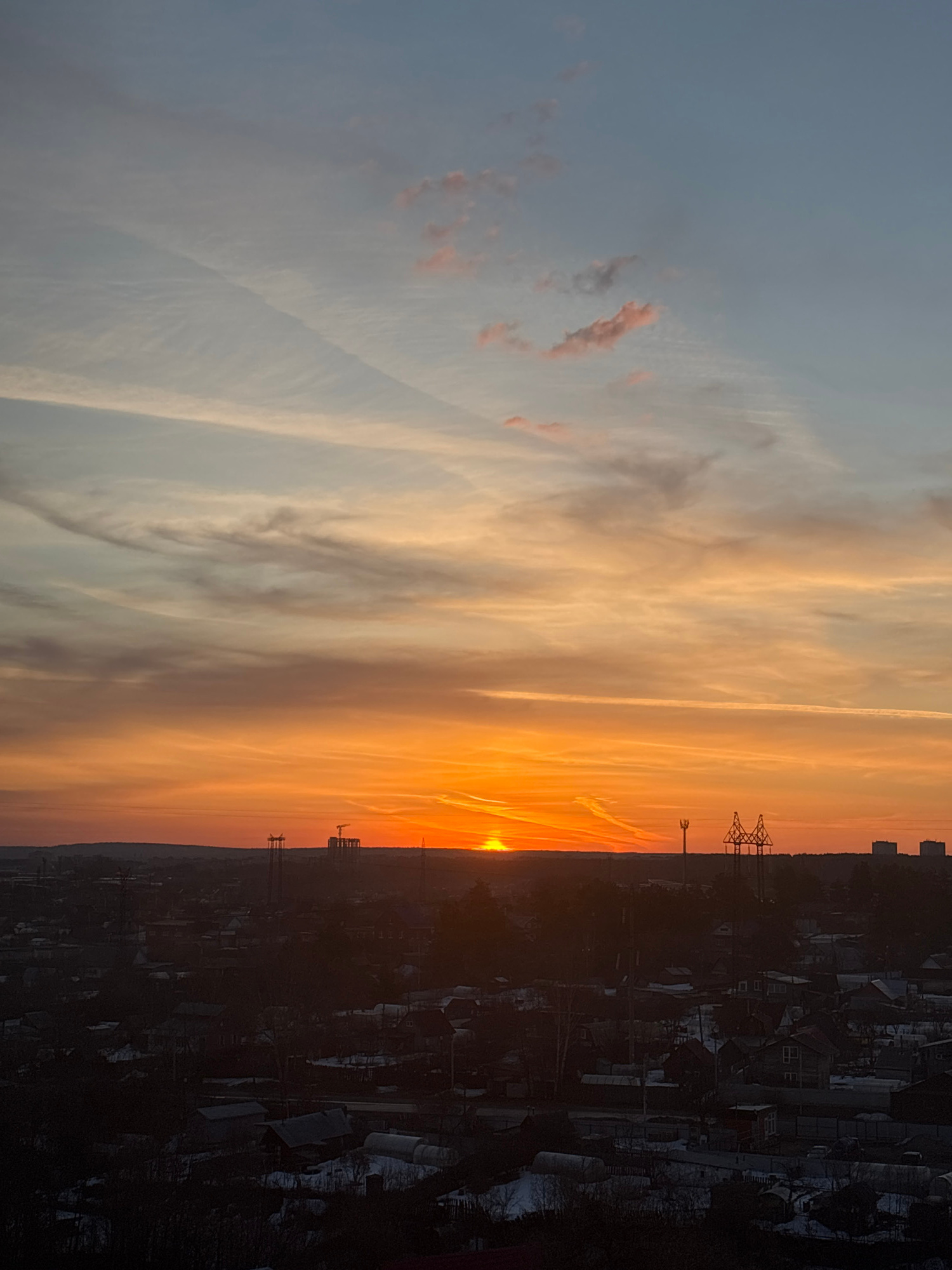 The image shows a vertical view of a sunset in the city of Chaikovsky, Russia. The sky is predominantly orange and yellow near the horizon, transitioning to a pale blue with light clouds in the upper…read more