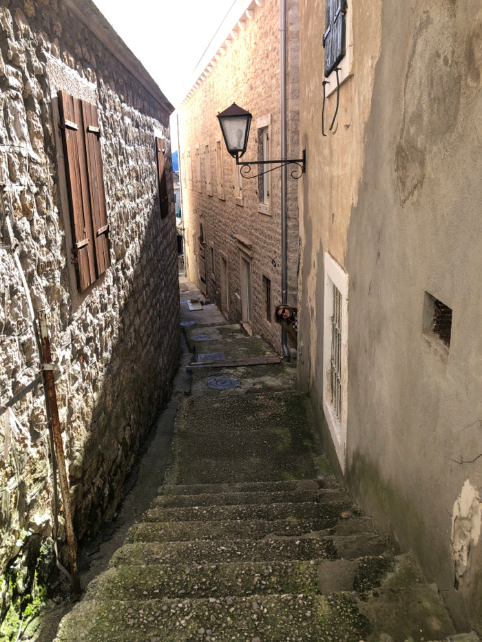 The image displays a narrow, stepped alleyway in Herceg Novi, Montenegro, descending into the distance under strong daylight. On the left, a building constructed of light-colored, rough-hewn stone bl…read more