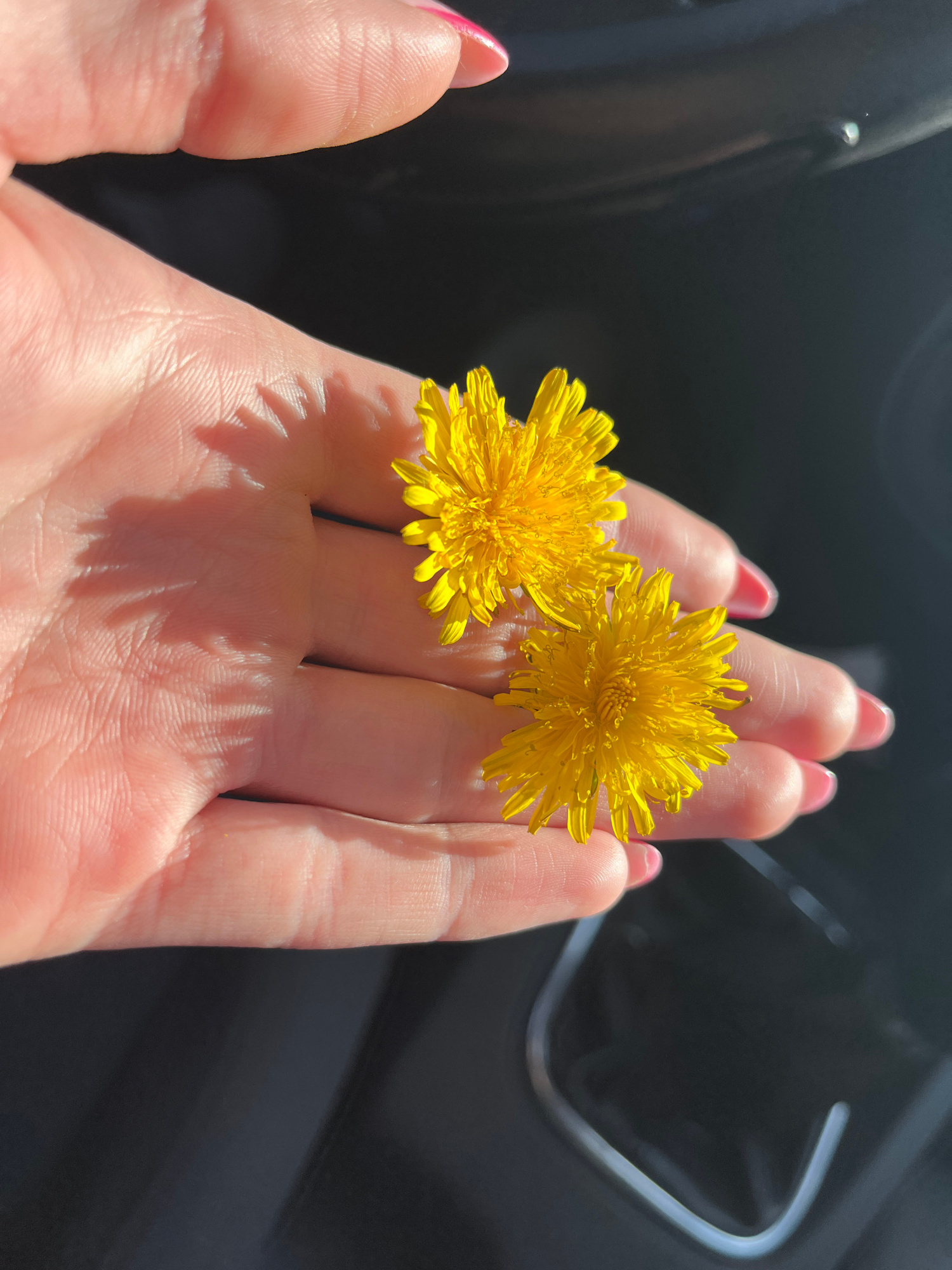 A fair-skinned hand with pink fingernails holds two yellow dandelion flowers. The background is a dark, blurry interior of a car, with a chrome accent visible. The image is brightly lit, casting shado…read more