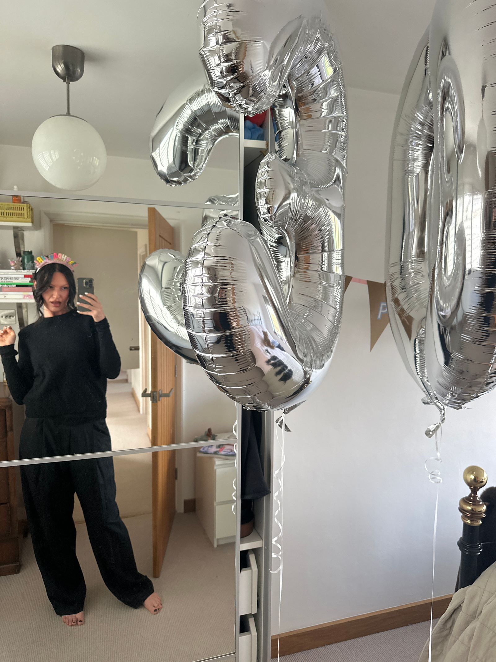 An indoor scene within a residential property in Tunbridge Wells, United Kingdom, is depicted. The primary subject is a female individual reflected in a large, floor-length mirror, taking a selfie wit…read more