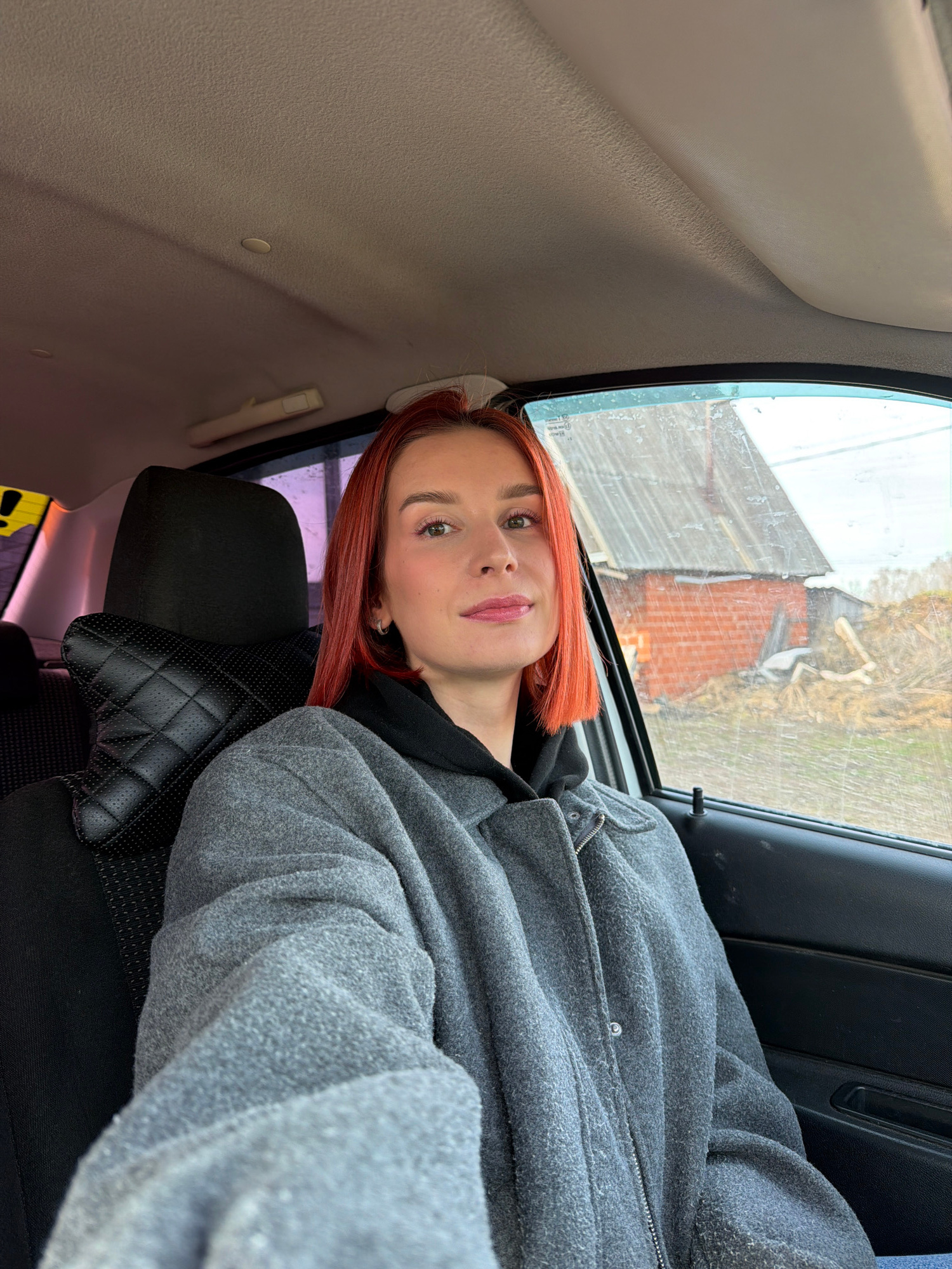 A woman with shoulder-length, auburn-colored hair is seated in the back seat of a car. She is wearing a gray, zippered, long-sleeved jacket over a black hooded shirt. The car seat is black leather wit…read more