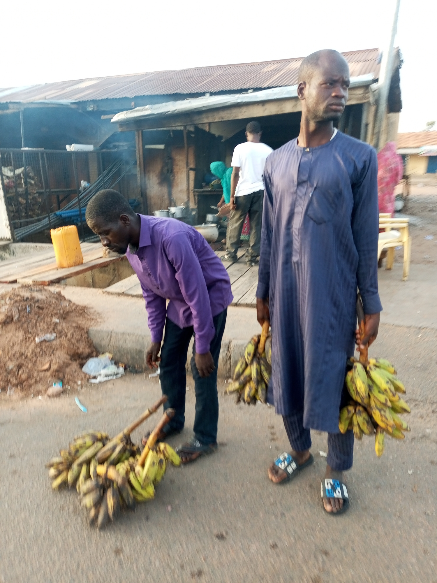 Two men stand on a paved street, likely in Gombe, Nigeria. The man on the left wears a purple long-sleeved shirt and dark jeans, bending over a bundle of plantains resting on the ground with two stick…read more