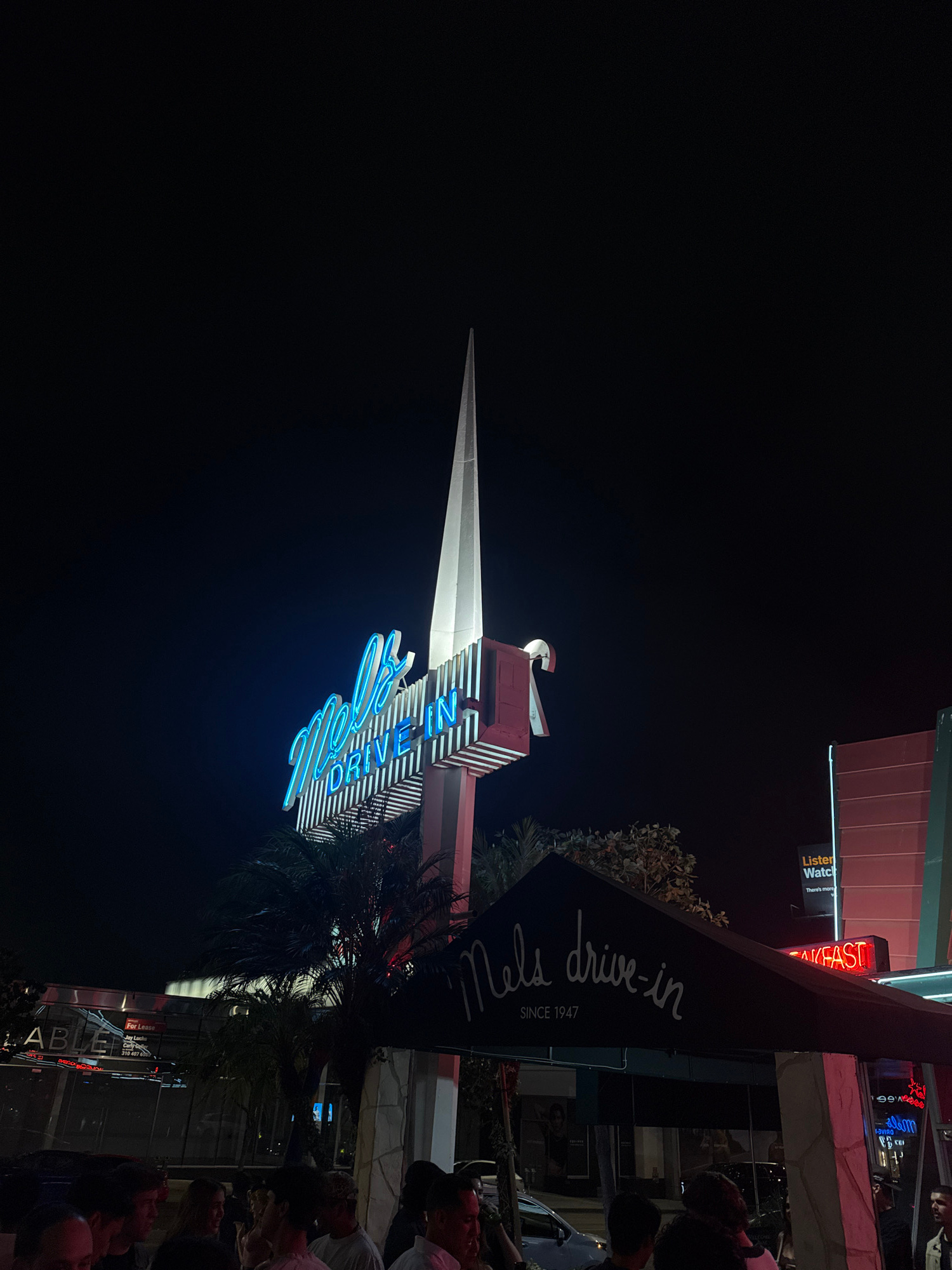The image showcases the "Mel's Drive-In" neon sign, taken at night in West Hollywood, USA. The sign is illuminated in blue against the dark sky. A large black sign displaying "Nels drive-in SINCE 1947…read more