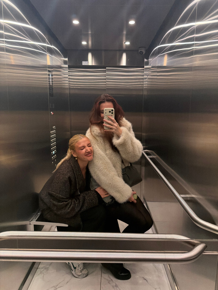Two women are in an elevator, one taking a selfie. The woman taking the photo has long brown hair and is wearing a furry white jacket. The other woman has blonde hair and a dark jacket. The elevator h…read more