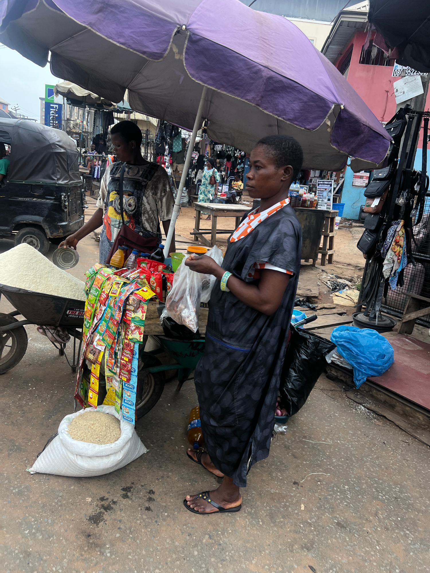 In Nkpor, Nigeria, a woman in a dark, patterned dress is buying a clear plastic bag of white rice from a vendor at a bustling street market. The vendor, standing under a large purple umbrella, measure…read more