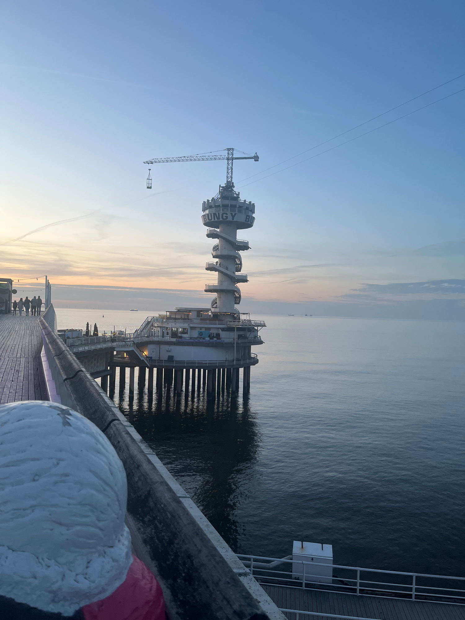 The image depicts a view from a pier in The Hague, Netherlands, at dusk or dawn. A prominent structure, the Pier Scheveningen, stands tall, featuring a tower-like structure with a spiral staircase and…read more