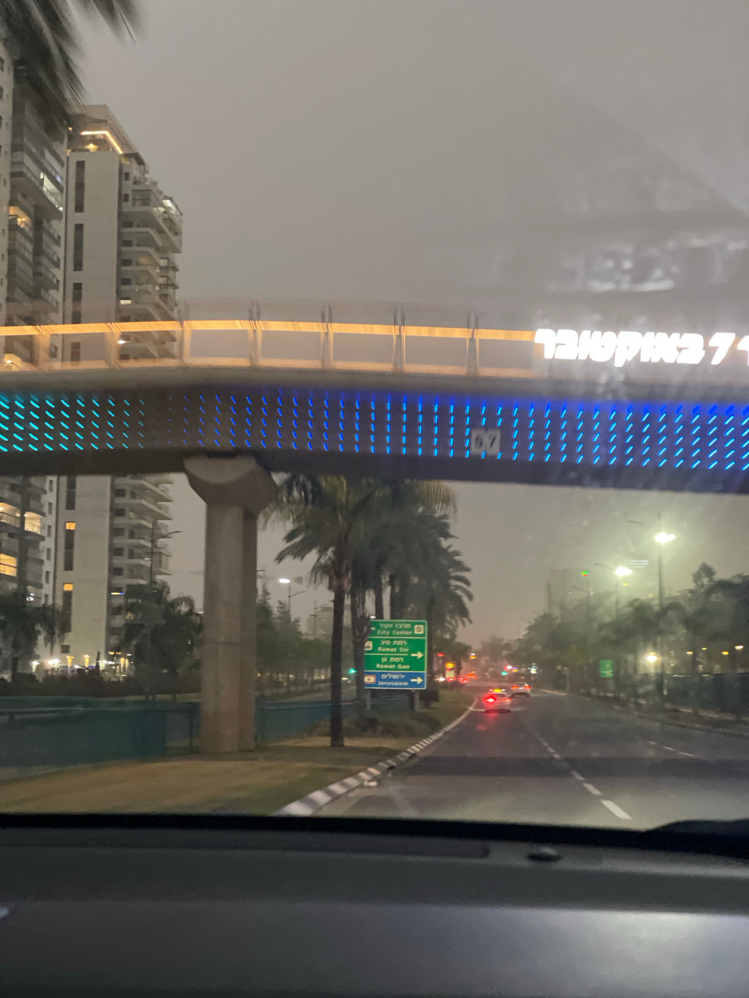 The image shows a street scene in Petah Tikva, Israel, on a rainy day. The view is likely taken from inside a vehicle, possibly a car or bus, as part of the vehicle frame is visible. A large illuminat…read more
