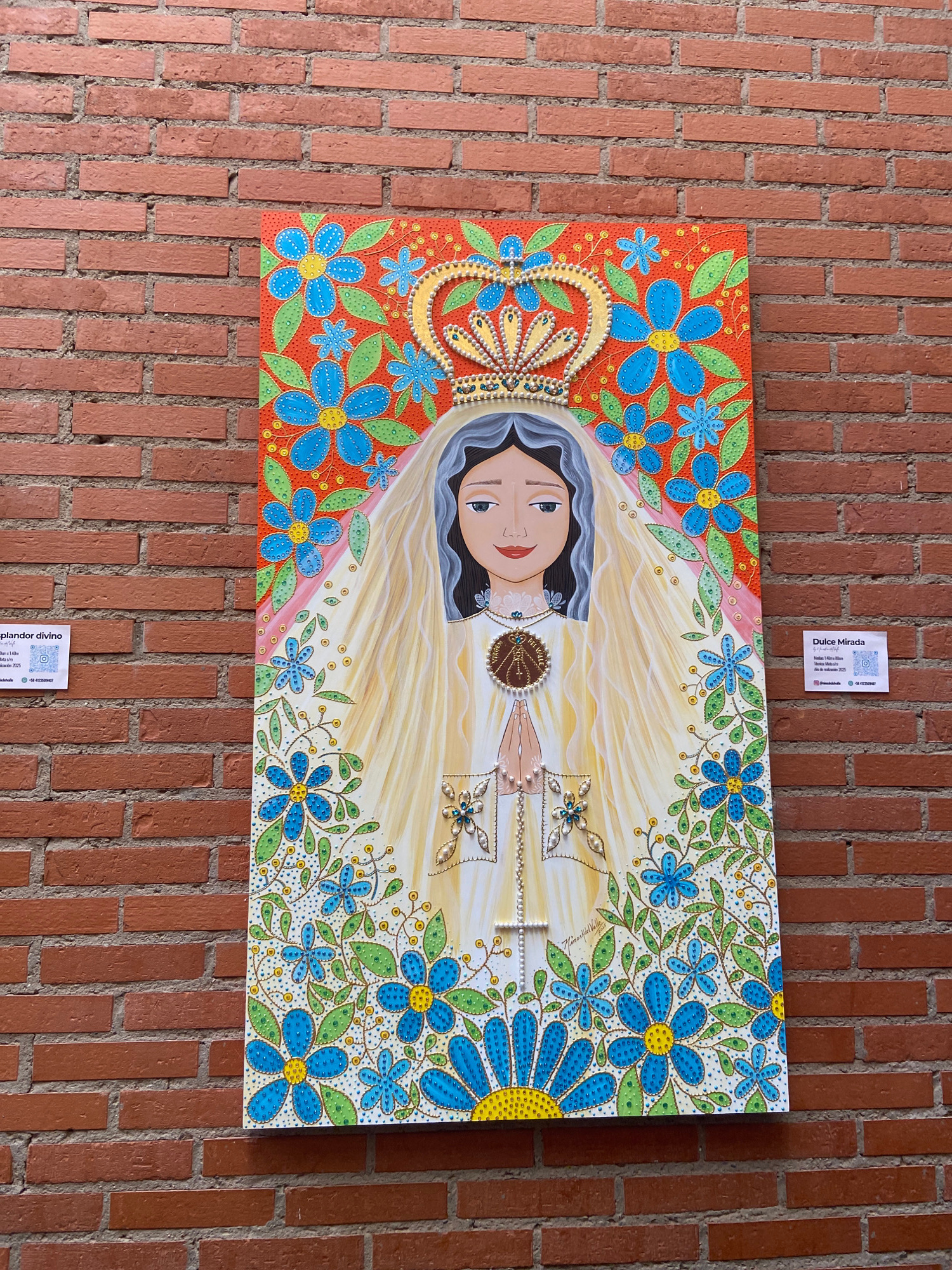 A close-up, medium-shot photograph of a vertically hung, rectangular painting on a red brick wall. The painting depicts a stylized religious figure, possibly the Virgin Mary, with dark hair, fair skin…read more
