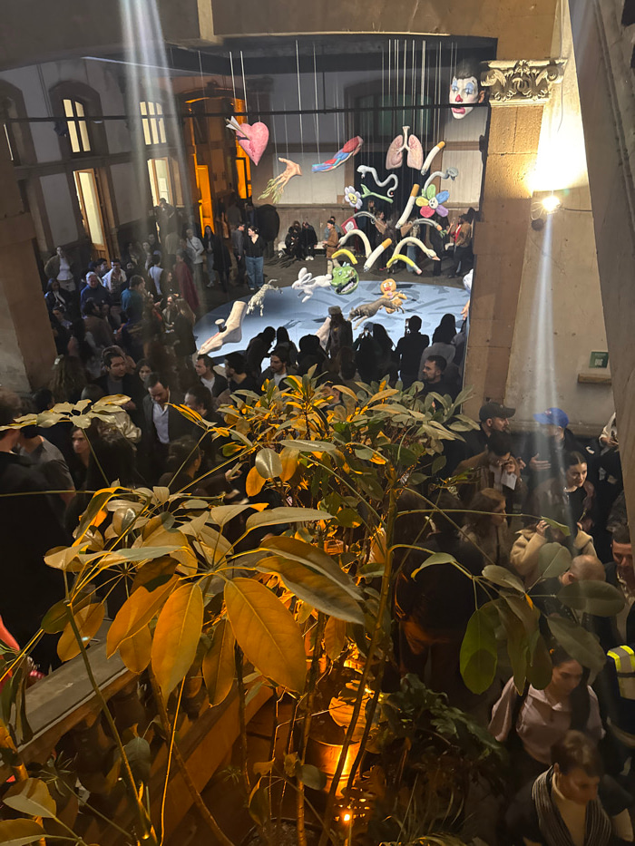 A nighttime gathering of people congregates around an art installation. The artwork features suspended, whimsical shapes like flowers, a heart, and lungs, arranged in a playful manner. Spotlights shin…read more