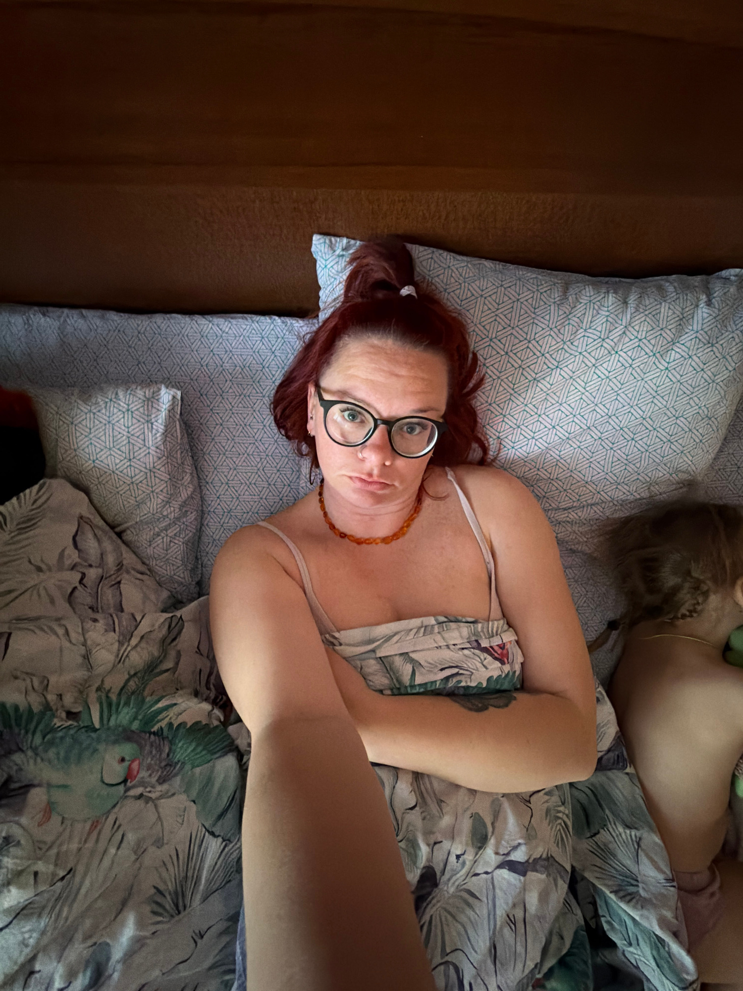 A woman with red hair and glasses lies on a bed next to a child. The woman wears a light-colored top and an amber necklace. The bed has a light blue pillow with a geometric pattern and a comforter witβ¦read more
