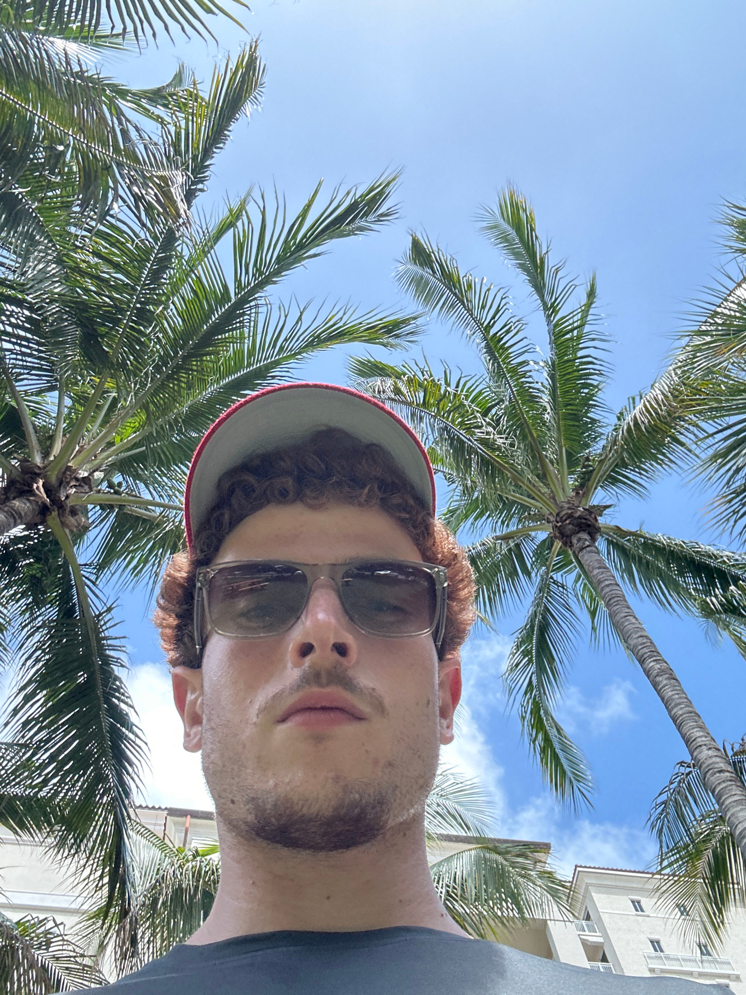 A selfie taken from a low angle under palm trees against a blue sky with some clouds. A man is wearing sunglasses and a hat with a red brim. A building is visible in the background to the right. The i…read more