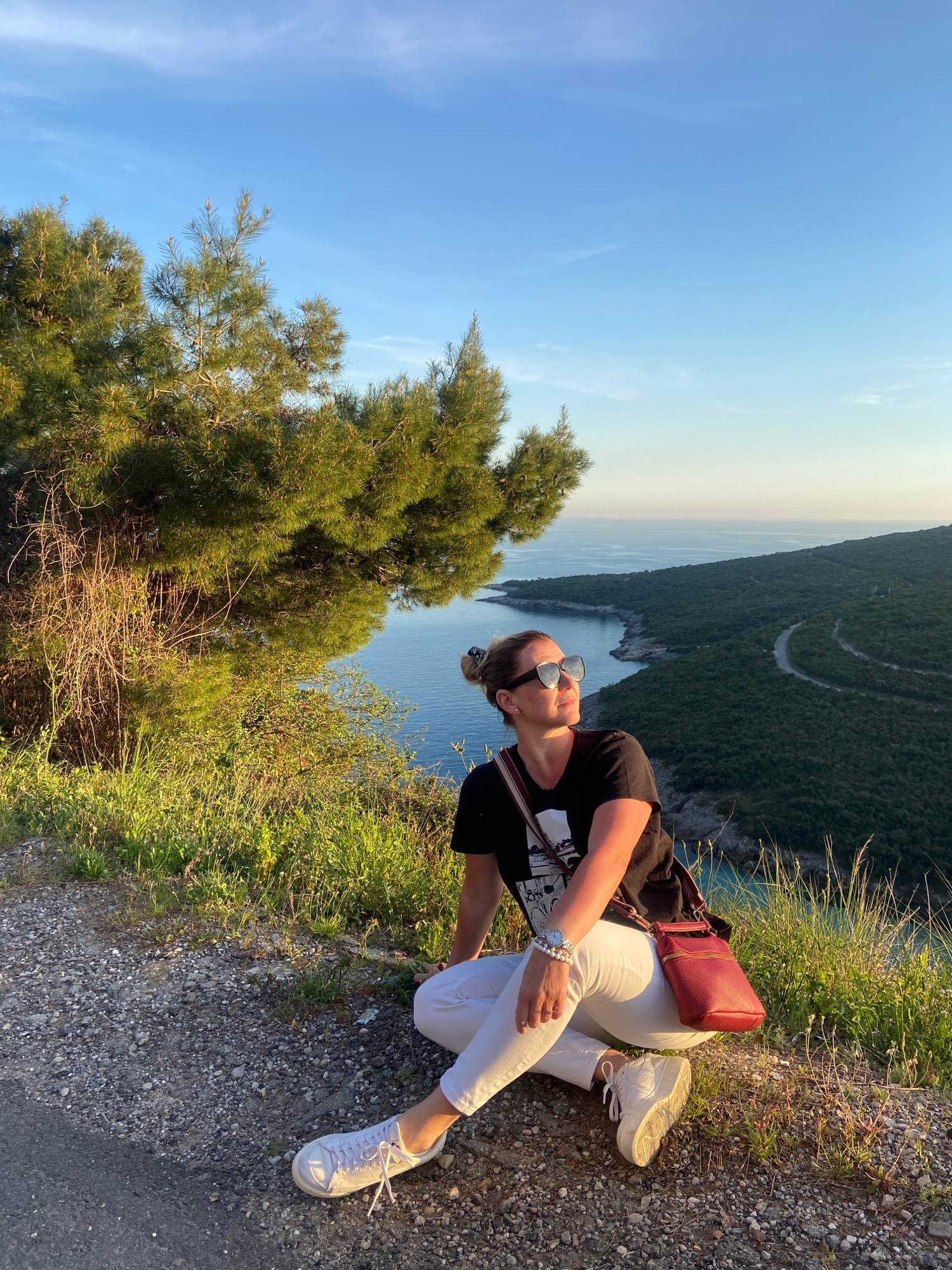 A woman is crouched on a grassy and gravelly clifftop in Dubraljevina, Montenegro, overlooking the Adriatic Sea. She is wearing sunglasses, a black t-shirt, white pants, and white sneakers, and has a…read more