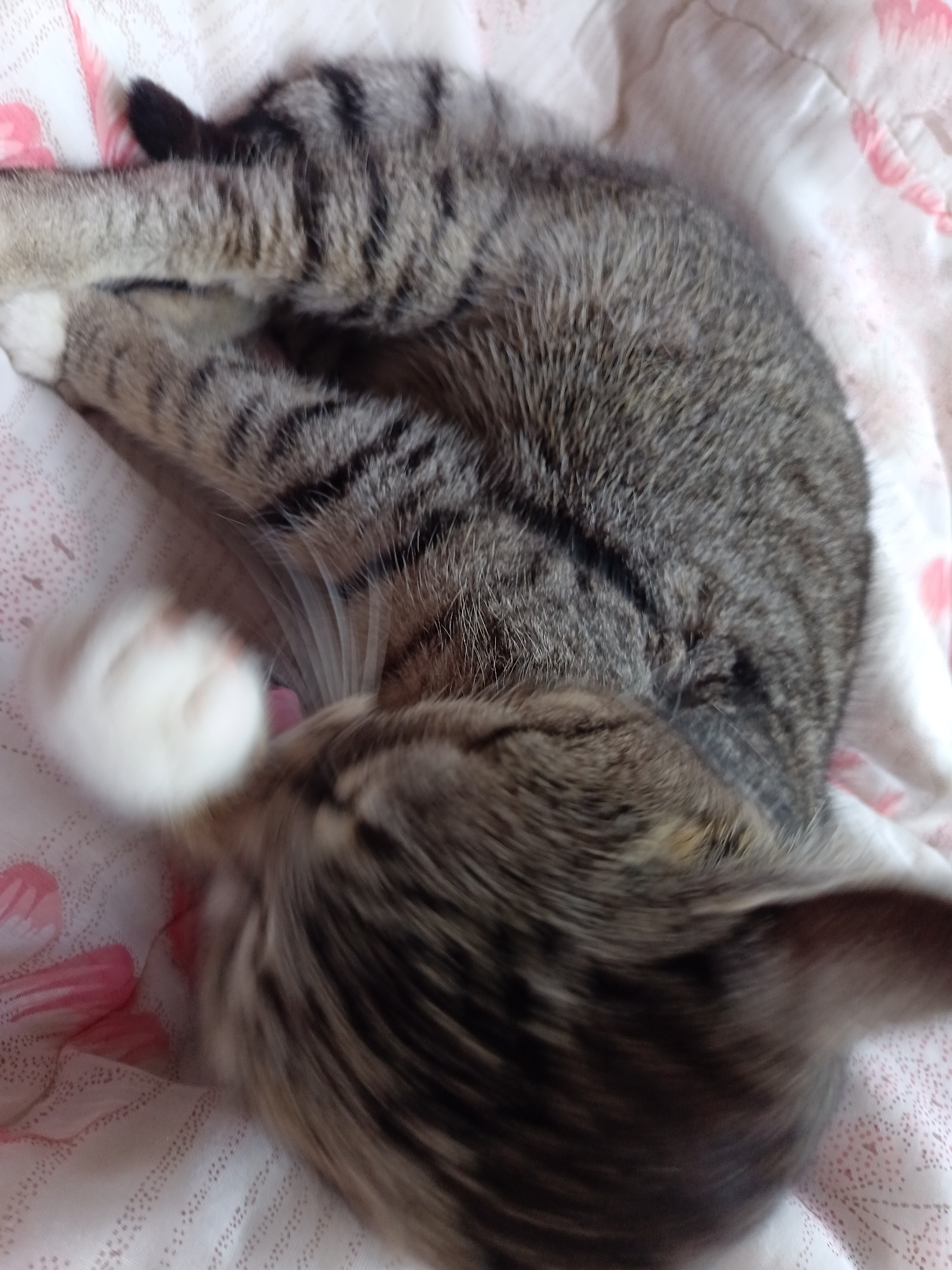 A gray tabby cat with white paws lies curled on a bed with white and pink patterned bedding. The cat's head is curled towards its belly, and its paws are tucked near its face. The photo appears to be…read more