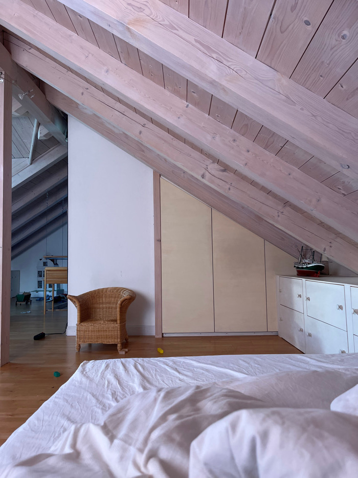 The image depicts an interior attic room in Hohenbrunn, Germany, viewed from a low perspective, partially over a white, rumpled duvet. The floor is constructed of light-toned wooden planks. The ceilin…read more