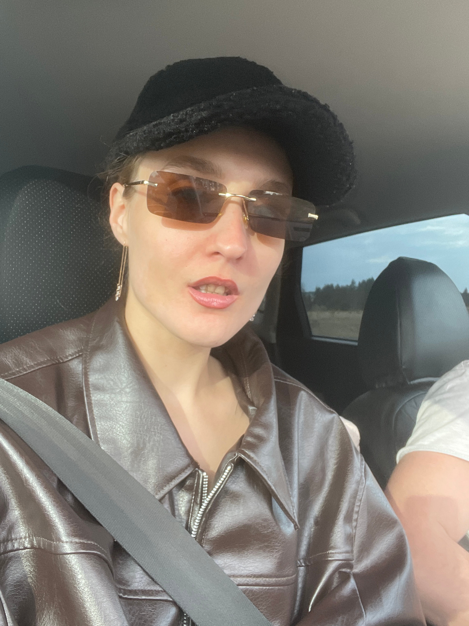 A person is seated in the front seat of a car, facing the camera. The image is taken indoors within a vehicle, identifiable by the dark car interior, seats, and a prominent dark gray seatbelt crossing…read more