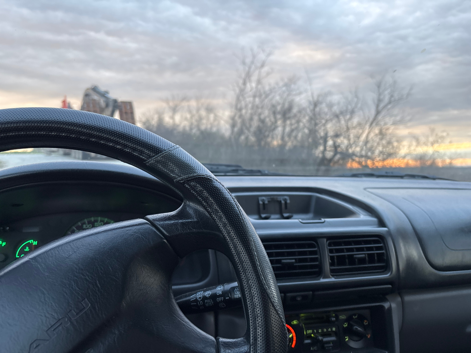 A view from the interior of a Subaru car, focusing on the steering wheel and dashboard, with an external view visible through the windshield. Outside, there are bare trees in the background and constr…read more