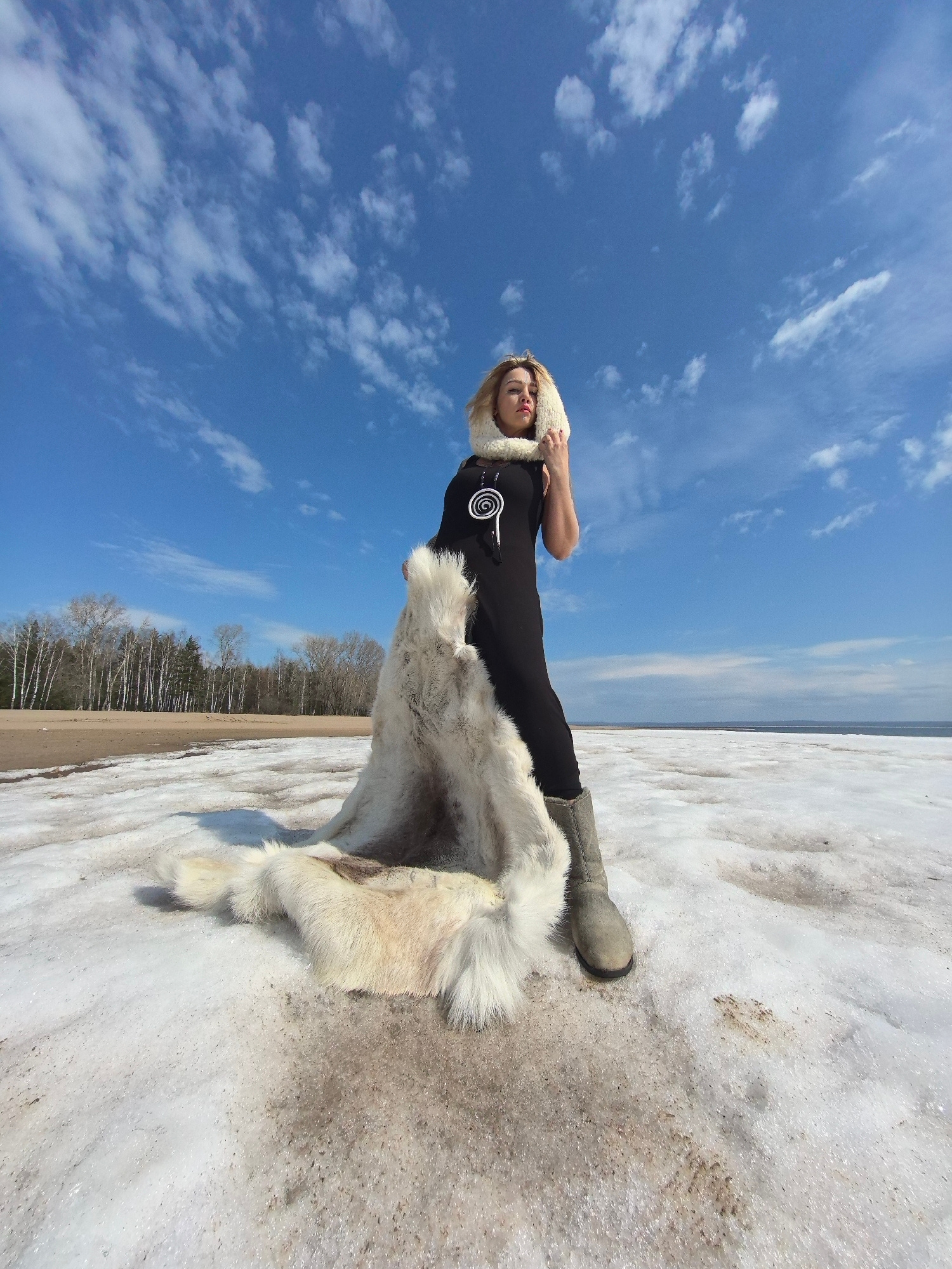 A low-angle, wide shot captures a woman posing on a landscape of melting snow and ice under a vast, bright blue sky dotted with scattered white clouds. The woman stands facing slightly right, looking…read more
