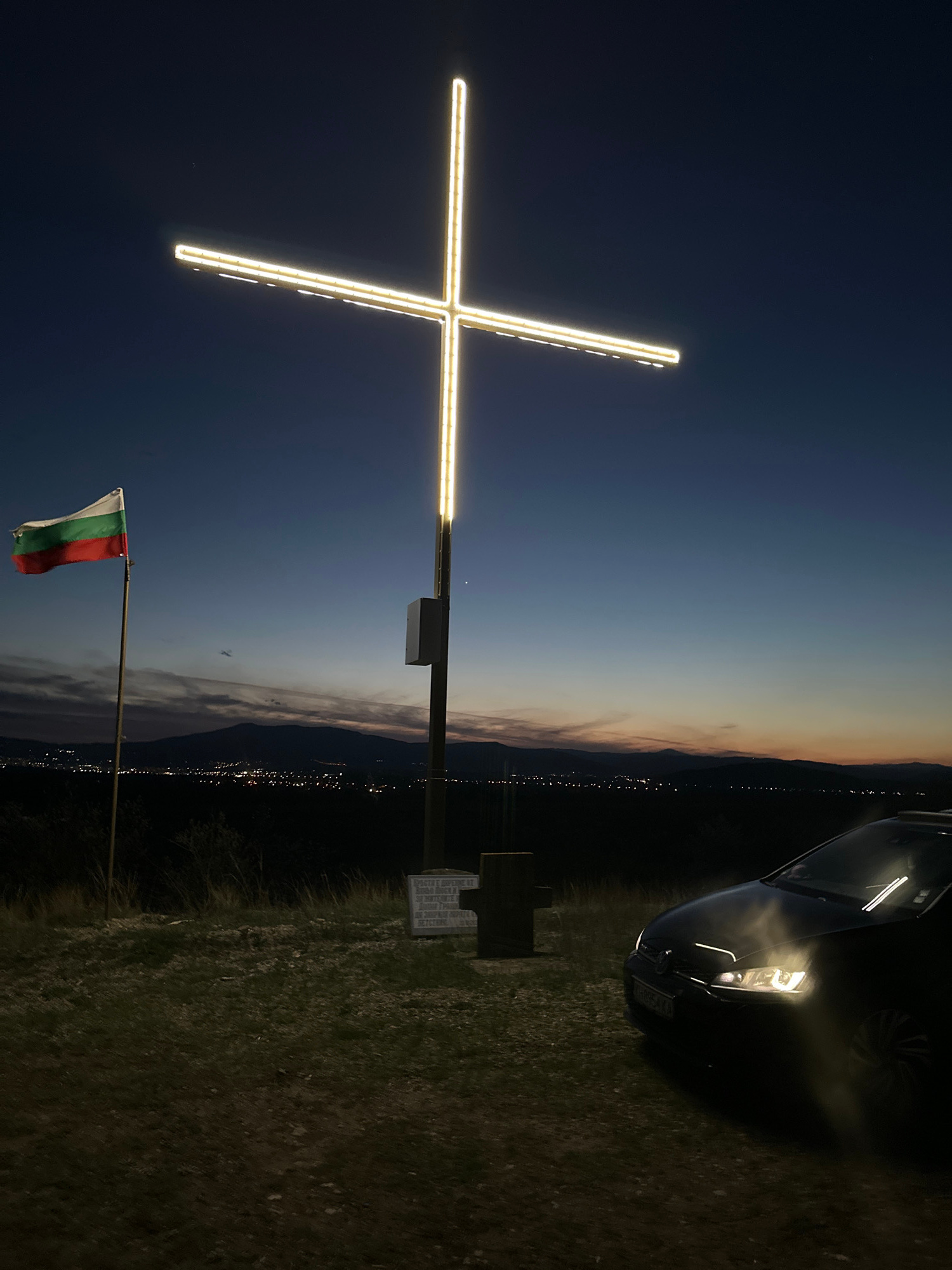 A nighttime scene shows a brightly lit cross at the summit of a hill, likely in Dolna Grashtitsa, Bulgaria. The cross is made of lights and stands tall against a sky transitioning from dark blue to or…read more