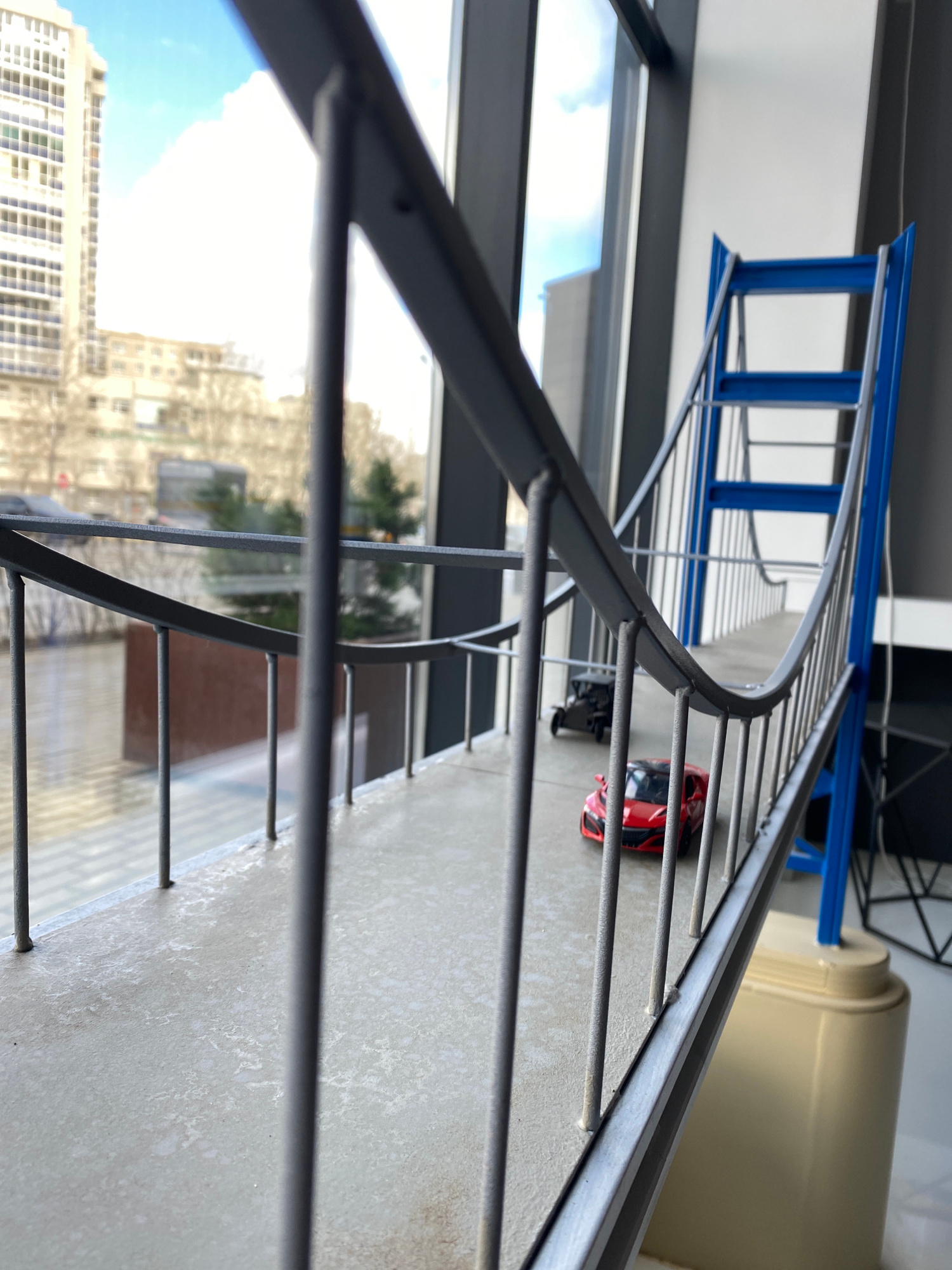 The image shows a spiral staircase viewed from a high angle, likely from the next level up. The railing is gray and has vertical bars. Outside the window, a cityscape is visible, with a building on th…read more