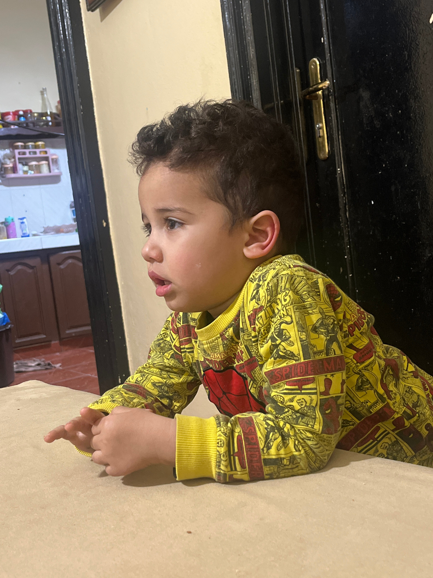 A young child wearing a yellow and red Spider-Man patterned shirt is leaning on a tan-colored surface. The background shows a partially visible interior: a black cabinet with a brass latch is visible…read more
