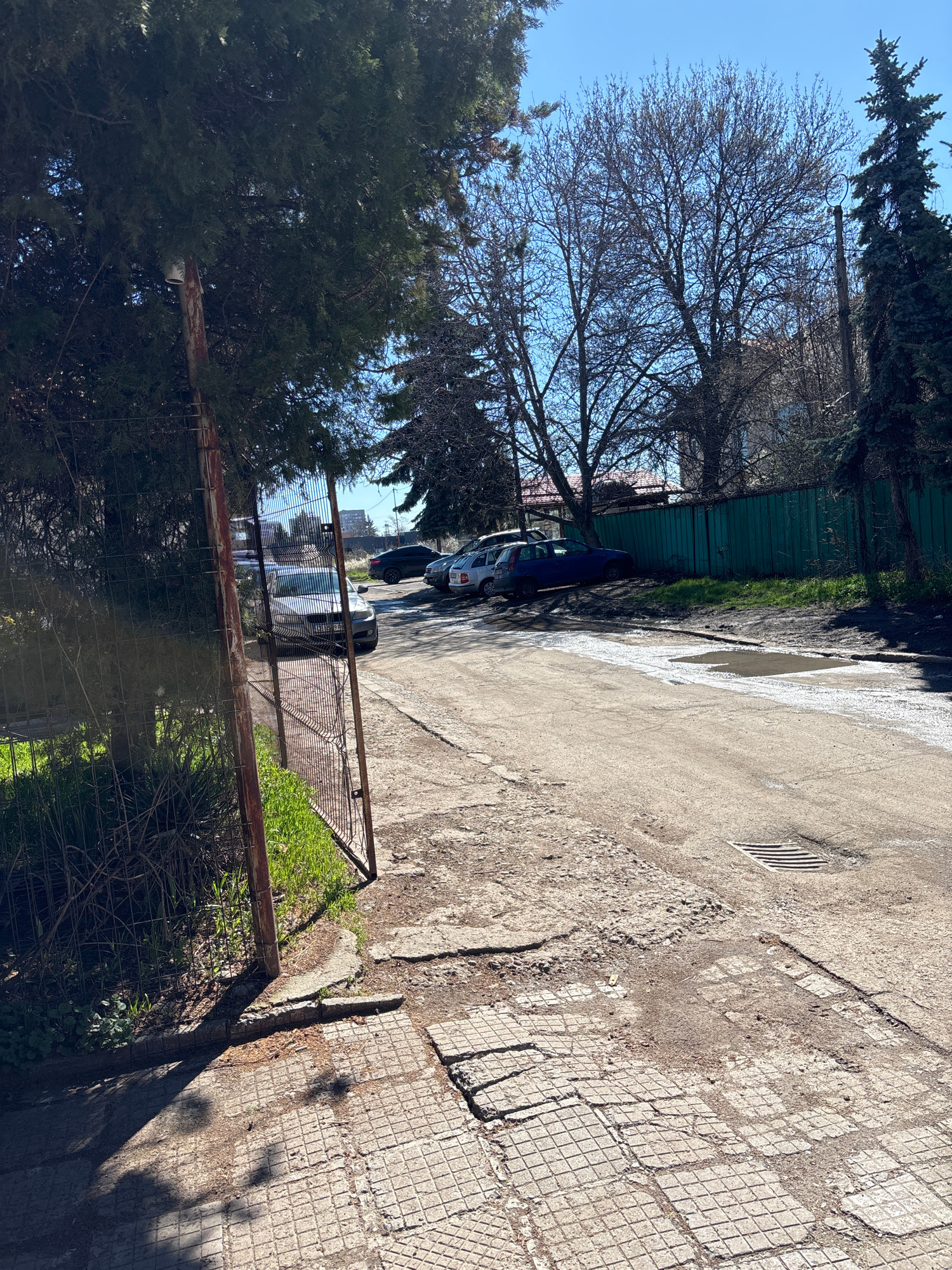The image shows a narrow street or alleyway in Sofia, Bulgaria. The ground is paved with a mix of concrete and patterned paving stones. A shallow puddle reflects the sky. A green fence runs along one…read more
