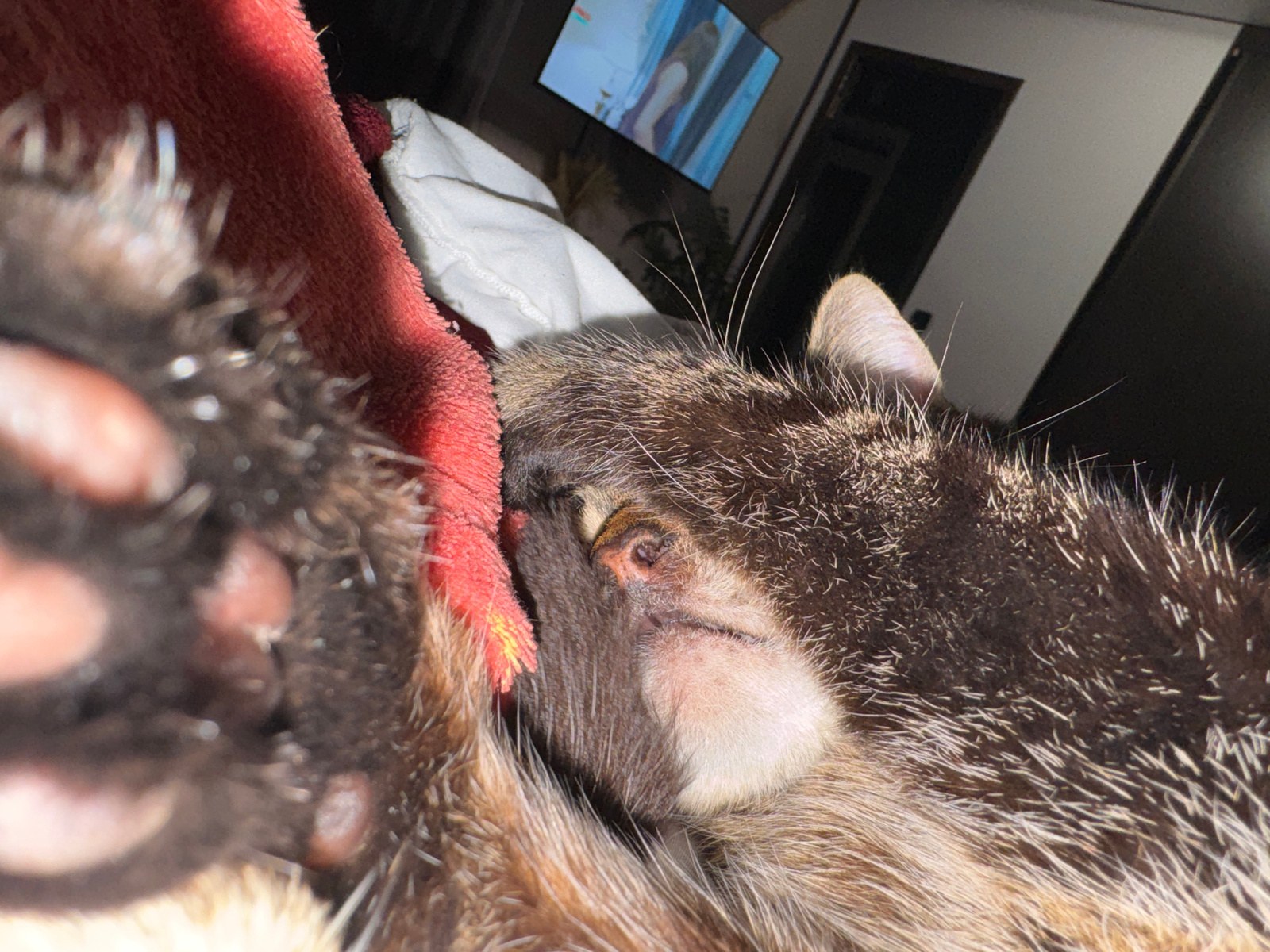 The scene depicts a close-up, diagonally oriented view of a spiny mammal, likely a hedgehog, situated in an indoor environment within the city of Chernushka, Russia. The animal occupies the central an…read more