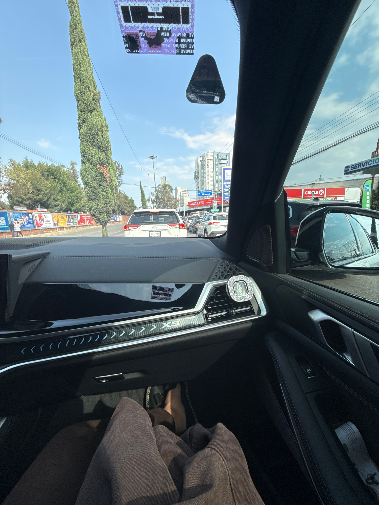 Here is a detailed description of the image: **Environment:** The image appears to be taken from inside a car, likely the driver's perspective. Outside, it's a bright day in what seems to be a bustli…read more