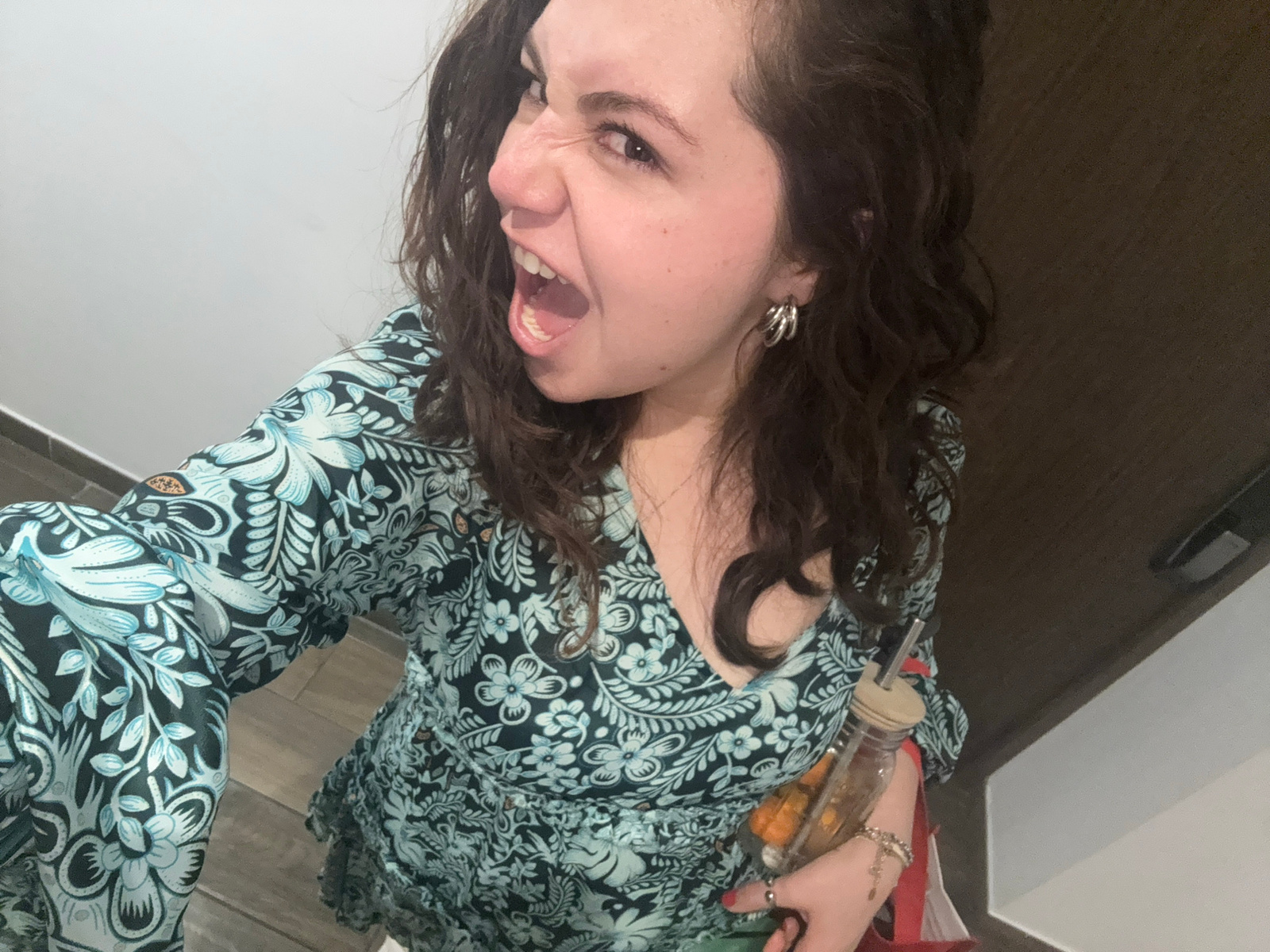 A woman with curly brown hair, fair skin, and an open mouth is pictured in this portrait-style image. She is wearing a patterned dress with a teal and dark floral design. She is holding a glass jar co…read more