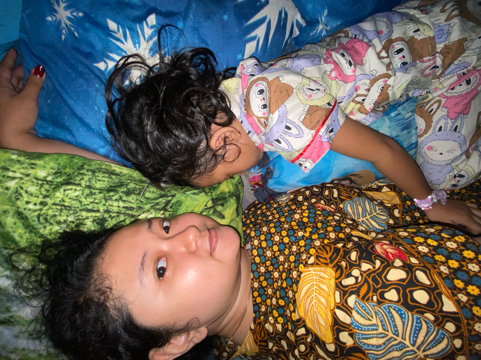 The photograph shows two individuals, presumably a mother and child, lying on a bed. The mother, on the bottom, is wearing a dark brown patterned top with yellow and blue floral designs. The child is…read more