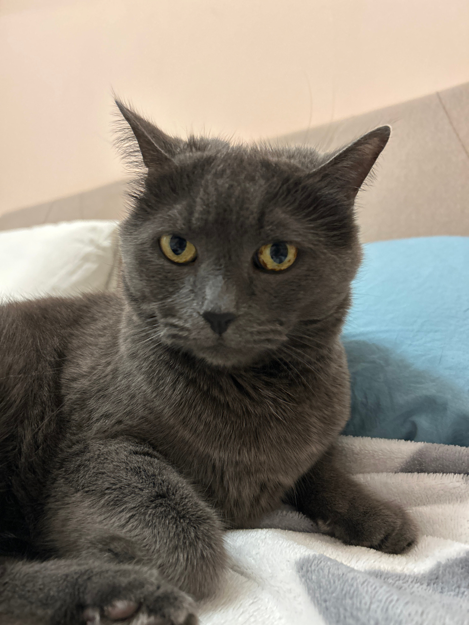 A gray cat with yellow eyes lies on a white and gray striped blanket with a blue pillow visible behind it. The cat is facing the camera with its head tilted. The background includes a plain off-white…read more