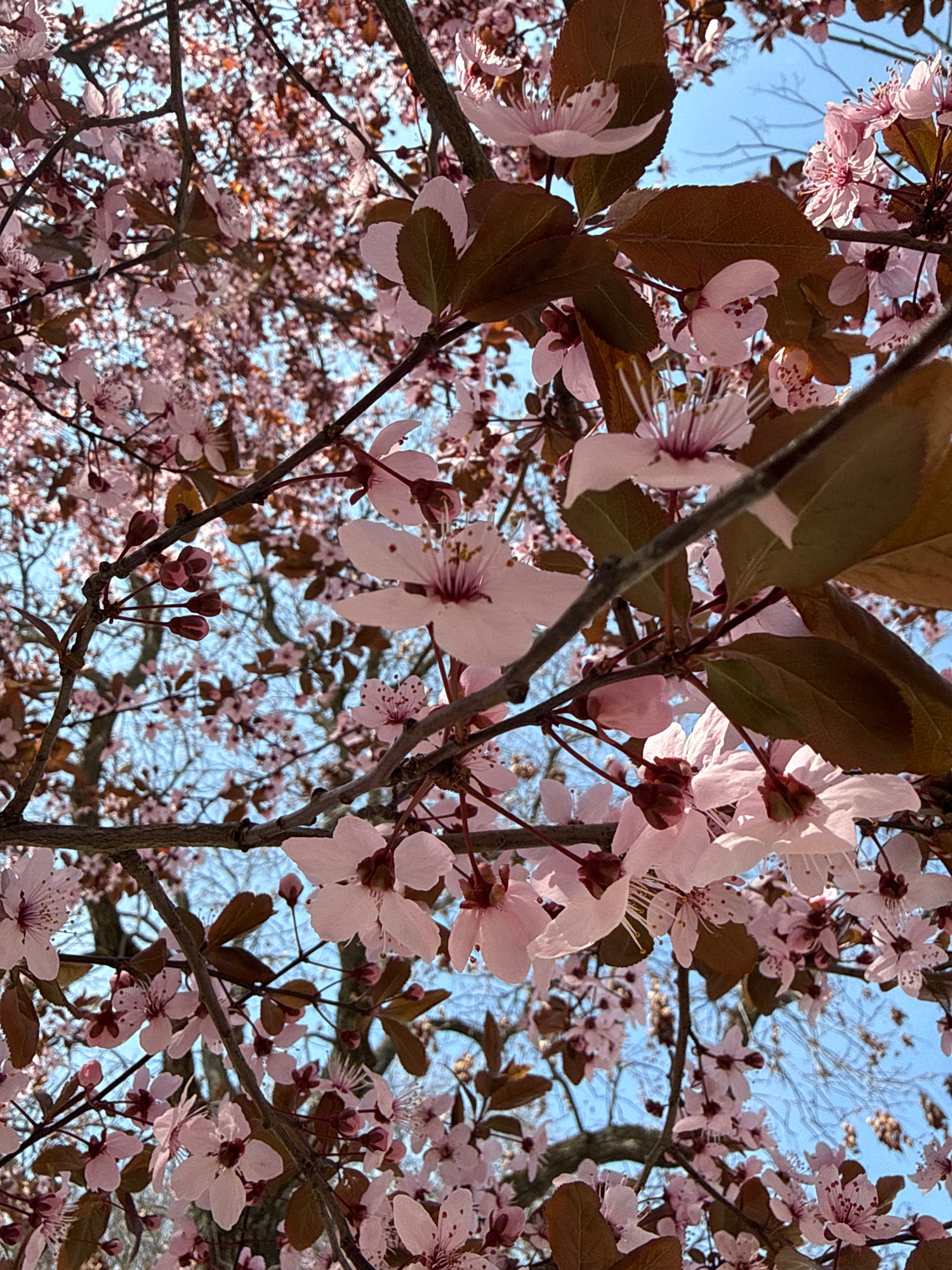 The image depicts pink cherry blossoms against a light blue sky. Brown leaves are visible among the flowers and branches. The location is presumably the city of Ruse, Bulgaria, as specified in the pro…read more