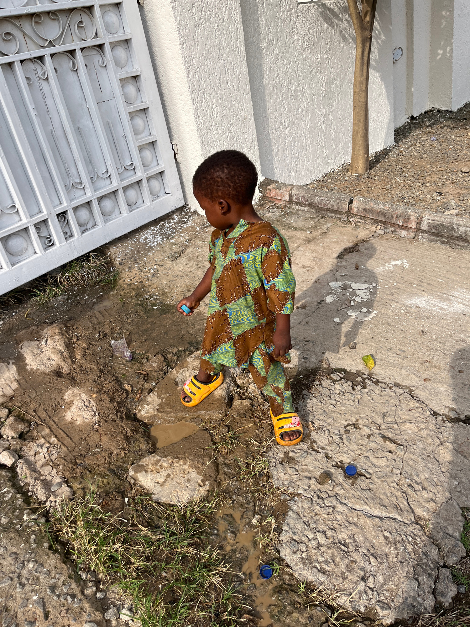 A young child in a brown and green patterned outfit and yellow sandals stands beside a gray metal gate, near a concrete path that adjoins a muddy area with scattered grass and debris. The scene is urb…read more