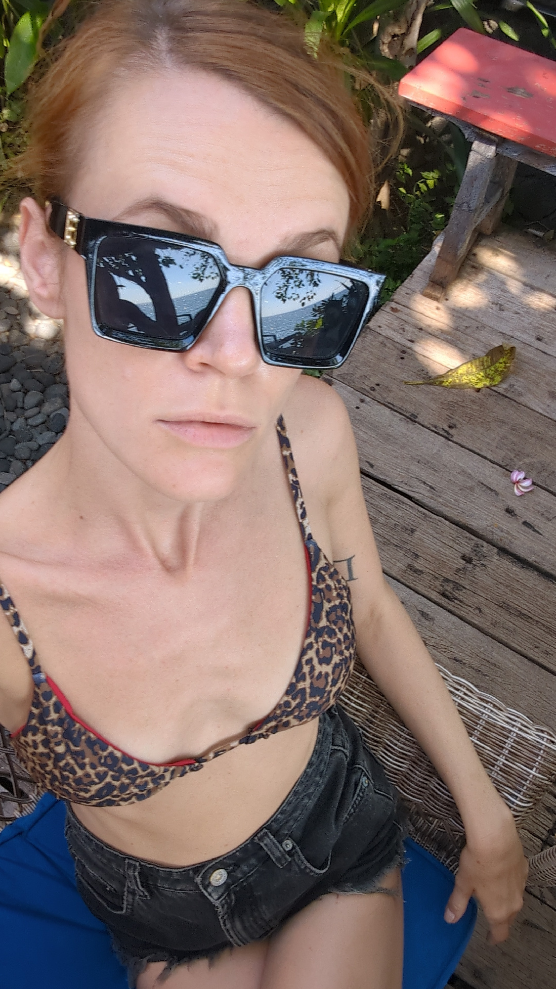 A woman is reclining in an outdoor setting, likely in Abang, Indonesia. She is wearing a leopard-print bikini top and dark denim shorts. She has on oversized, black-framed sunglasses that reflect the…read more