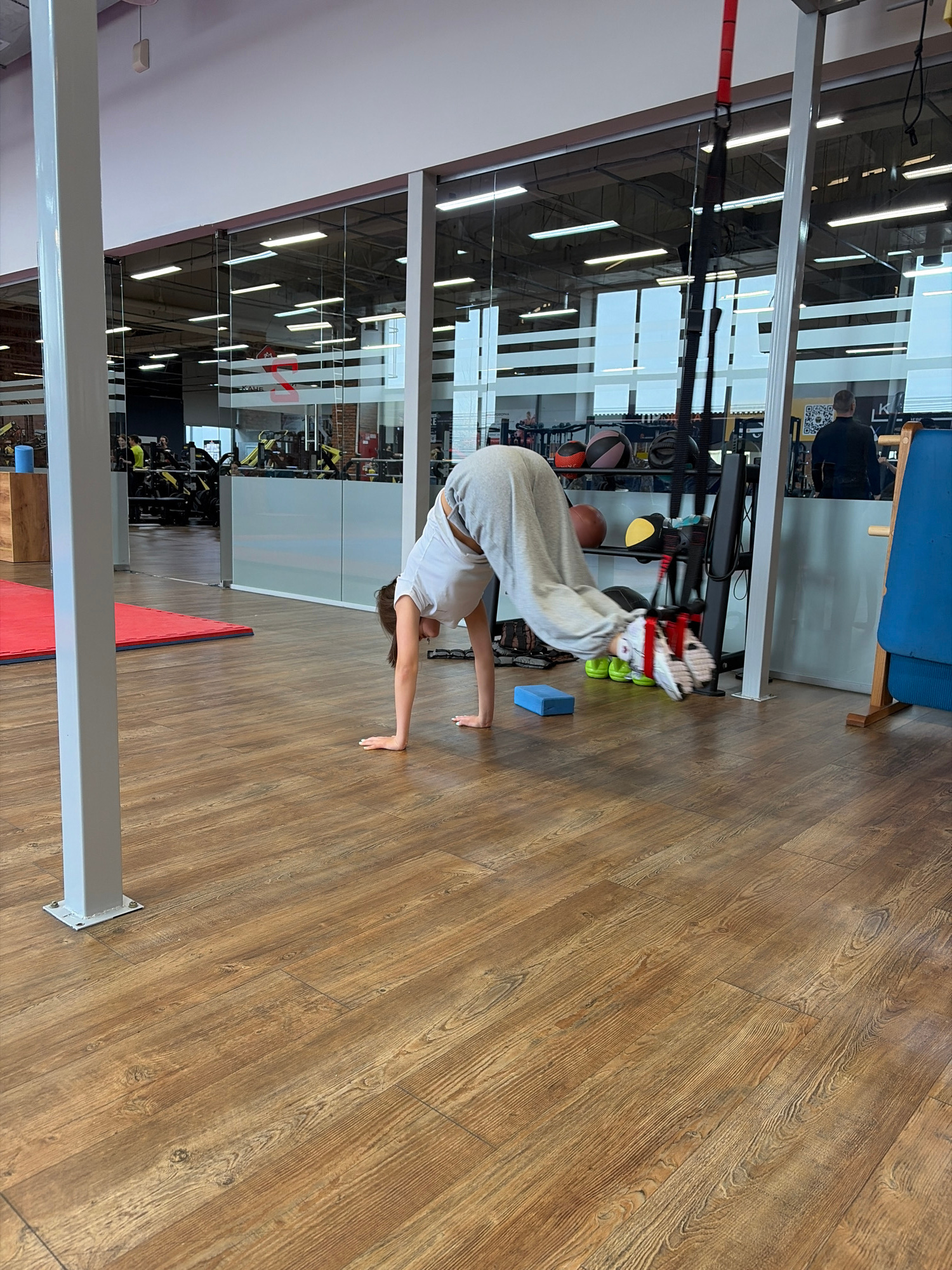 A person is performing a headstand in what appears to be a gym or fitness center. The person is wearing light-colored shorts and a grey sweatshirt. Their hands are on the floor, supporting their body.…read more