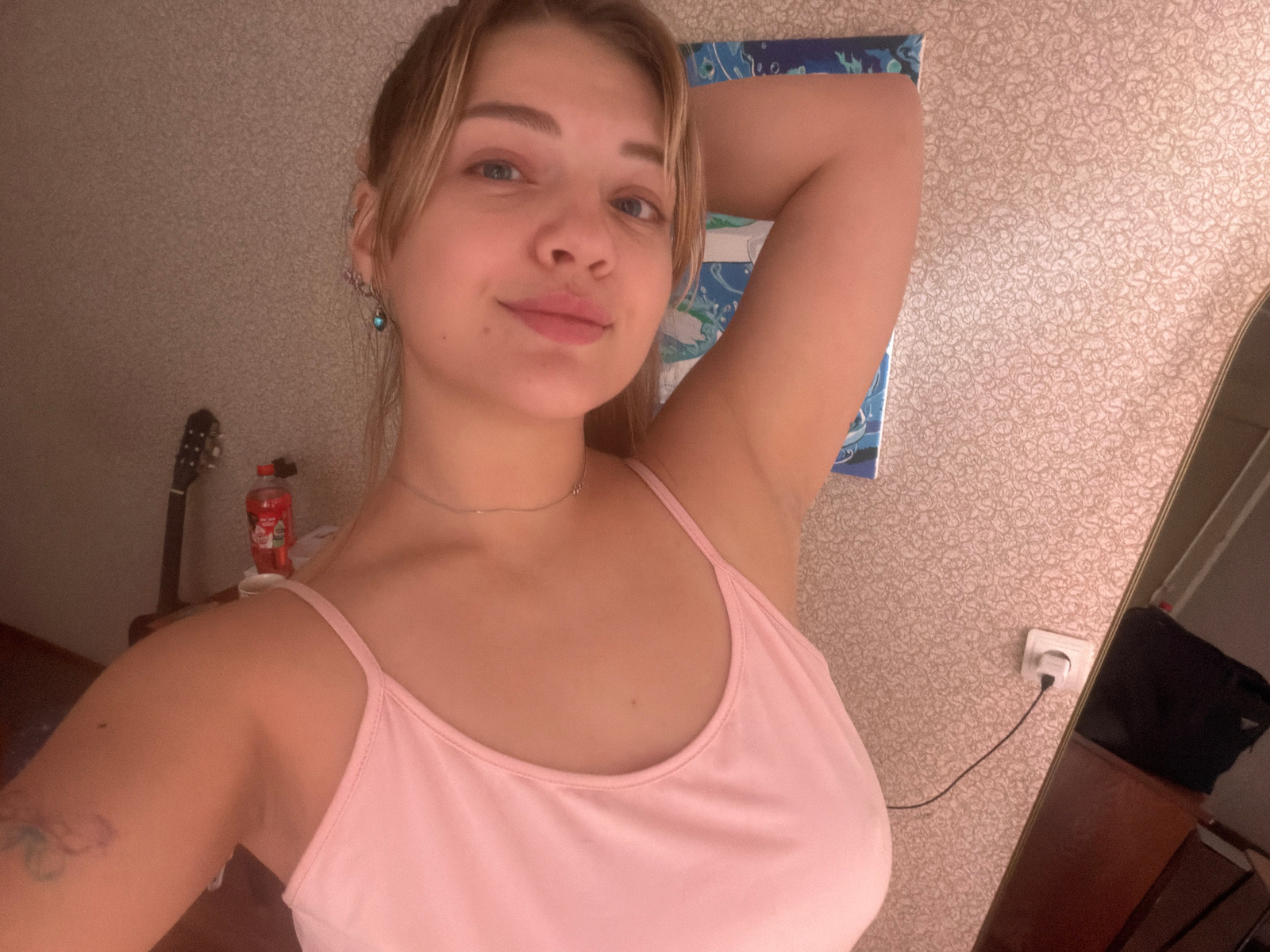 The image is an inverted, close-up selfie, taken indoors, featuring a young woman looking directly at the camera. Her head is positioned at the bottom of the frame, with light-colored hair framing her…read more