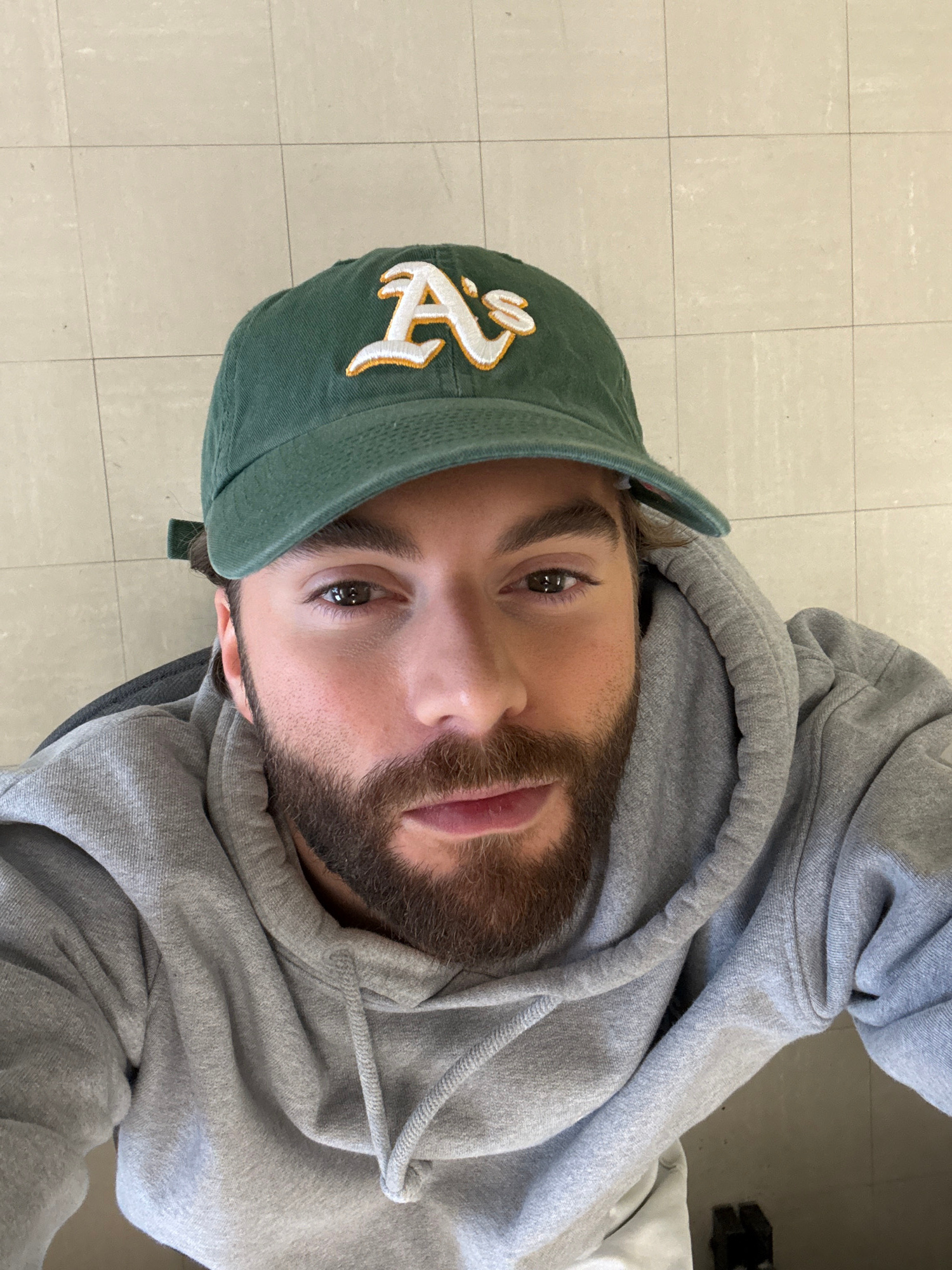 A man with a beard and wearing a grey hoodie and a green baseball cap with the letter "A" on it is lying on a light-colored tiled floor. The location cannot be identified as Montreal, Canada based on…read more
