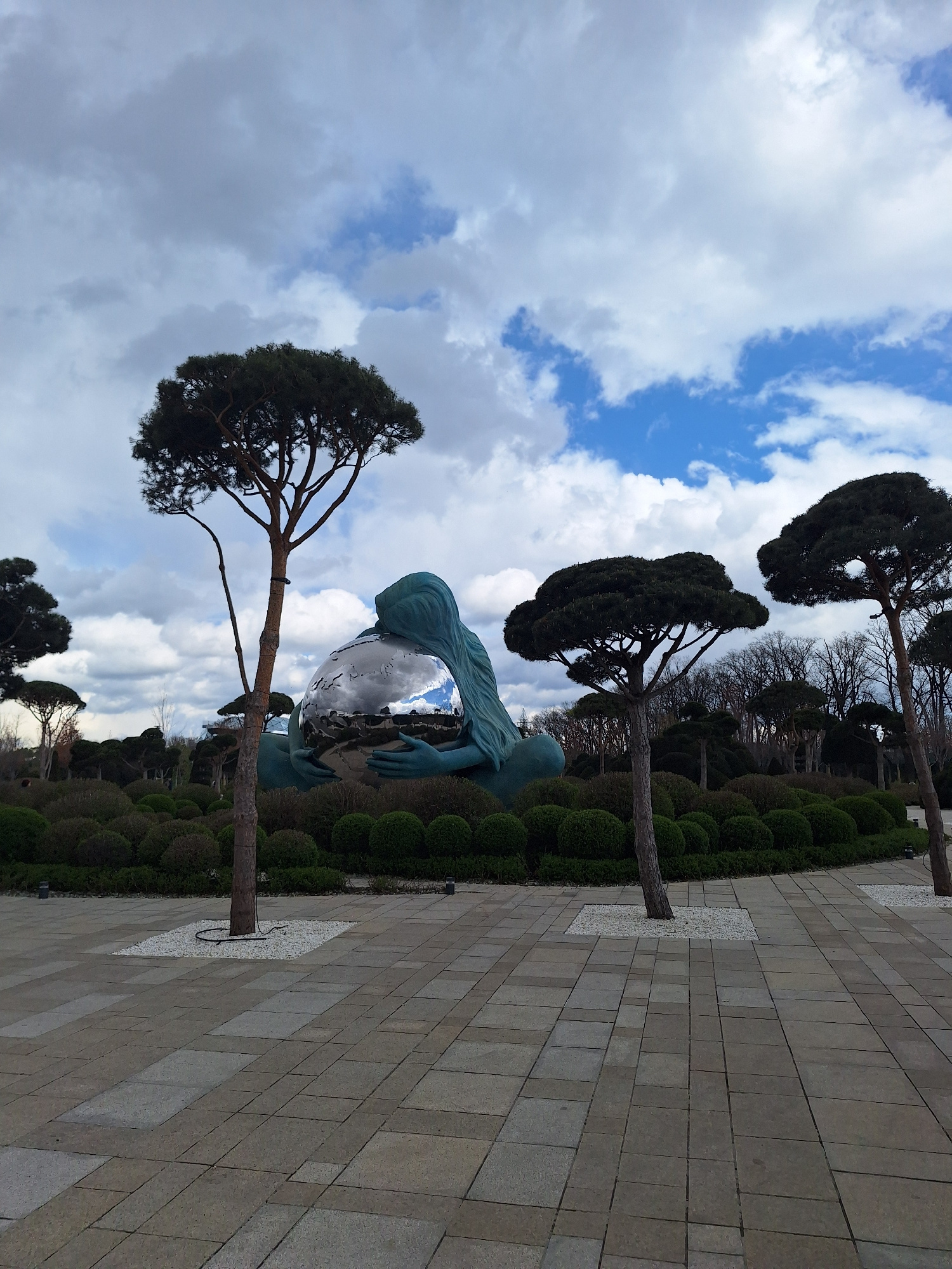 The image shows a statue of a woman holding a mirrored sphere in a park in Krasnodar, Russia. The park is paved with rectangular stones. The statue is surrounded by trimmed bushes and tall pine trees.…read more