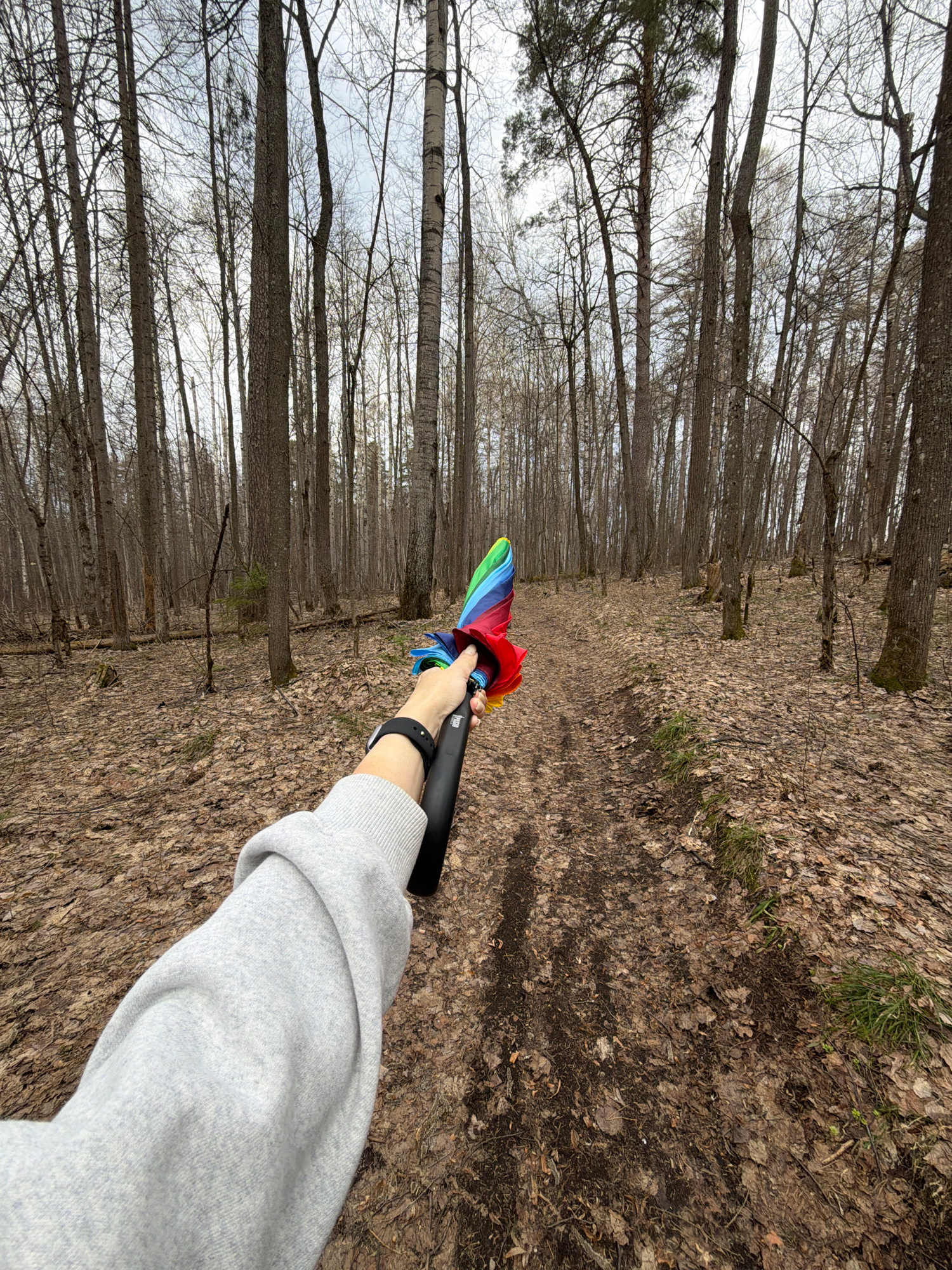A first-person perspective shot shows an arm extended, holding a closed rainbow umbrella in a wooded area. The arm wears a light gray sweatshirt and a black wristwatch. The ground is covered in dry le…read more