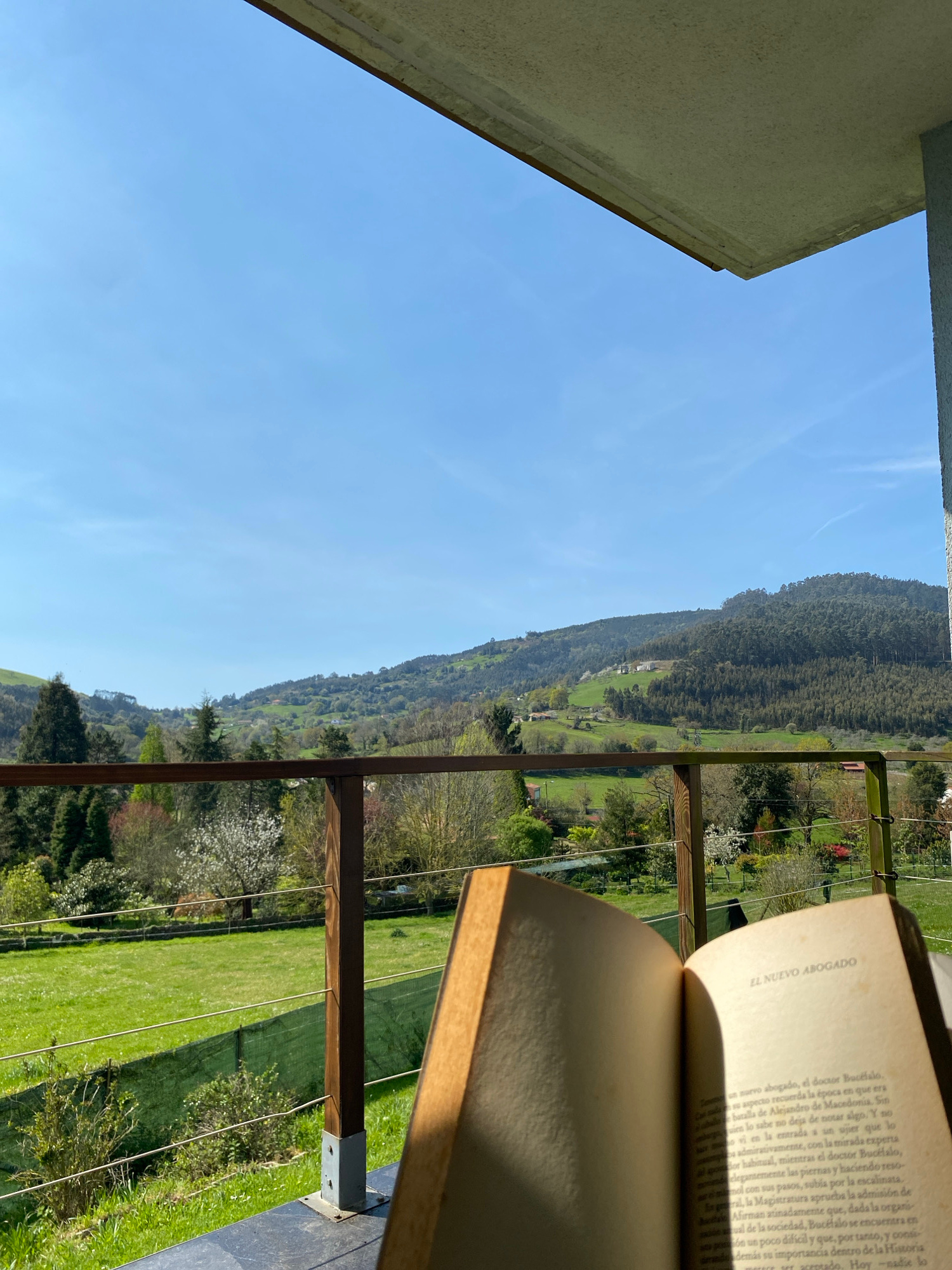 The photograph depicts an open book titled "El Nuevo Abogado" resting on a balcony, possibly in a residential setting. In the background is a landscape with green fields and a tree-covered mountain. T…read more