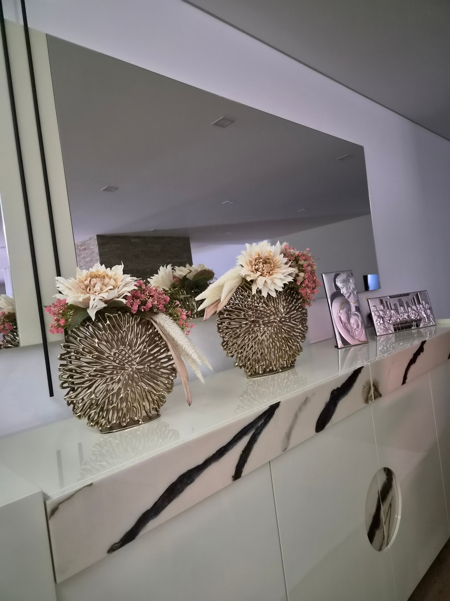 The image depicts a modern interior bathroom or powder room, likely in a residential or commercial space in Barcelos, Portugal. The scene features a large rectangular mirror positioned on a wall. Refl…read more