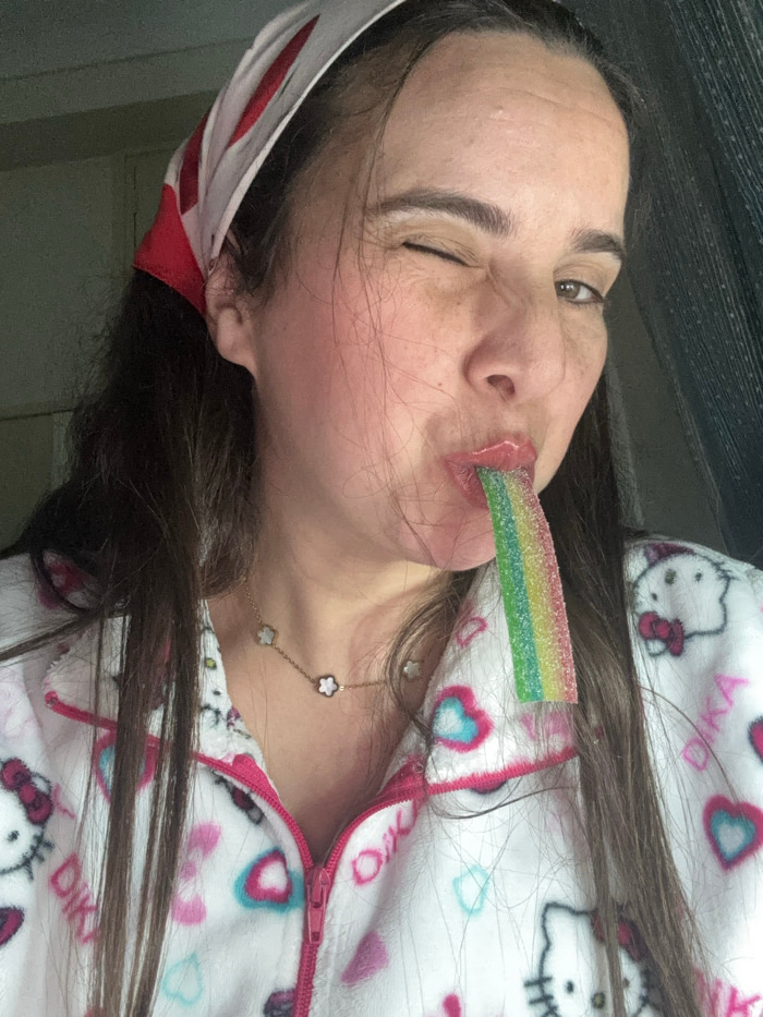 A woman with long brown hair and wearing a white headband and a Hello Kitty pajama top winks and holds a rainbow-colored candy strip in her mouth. She wears a delicate gold necklace with flower-shaped…read more