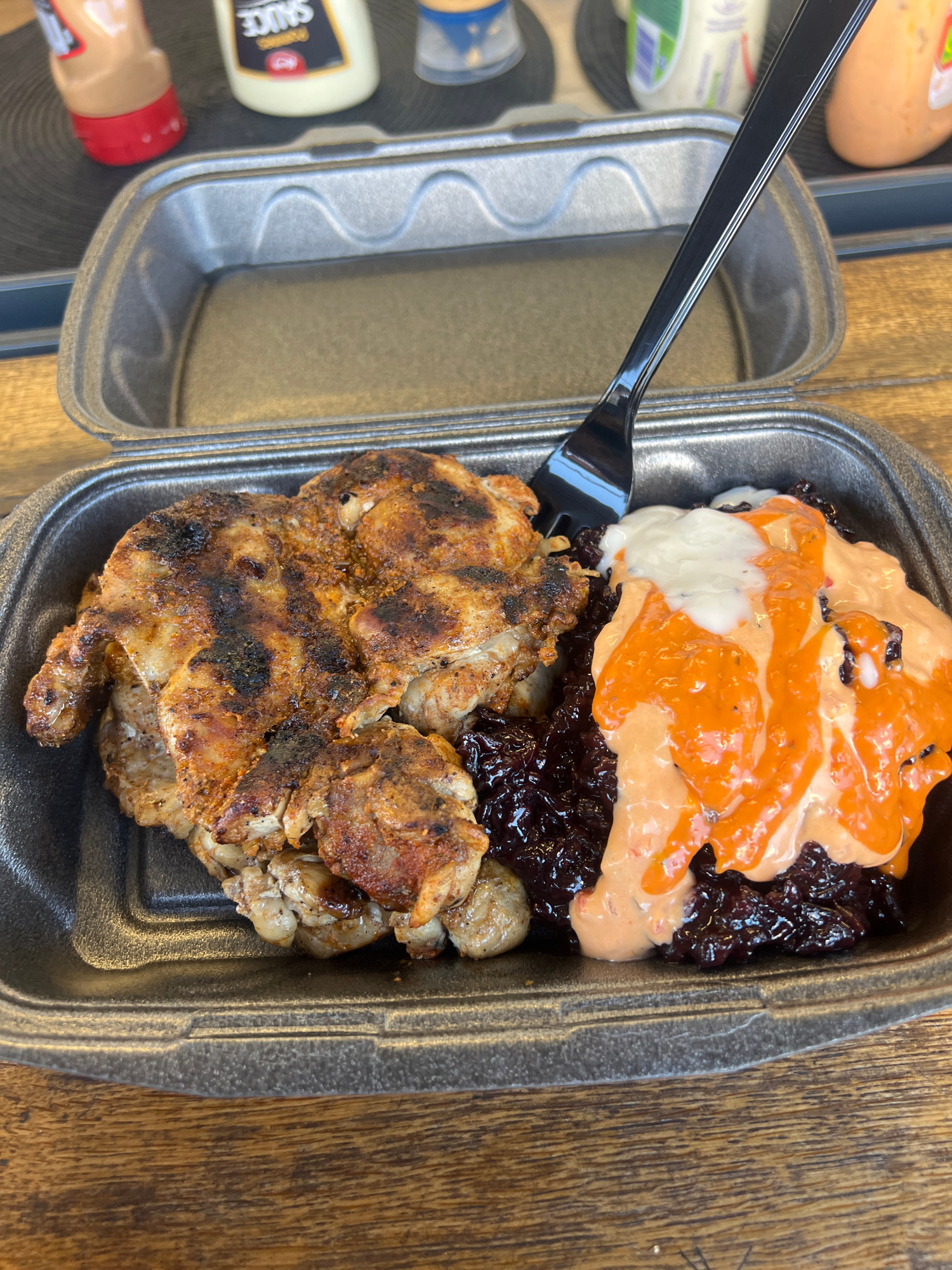The image shows a takeout container of food, likely photographed on a wooden table, possibly in Burgas, Bulgaria (though this can't be definitively confirmed from the image alone). The container, made…read more