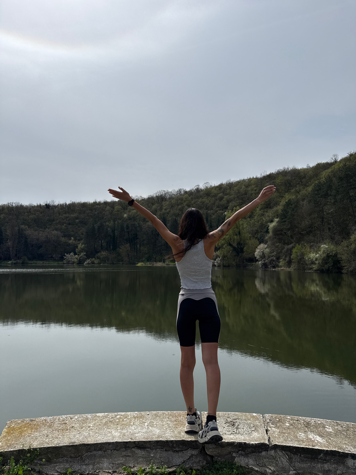 A young woman stands on a weathered concrete ledge. Her arms are outstretched, perpendicular to her body. She wears a light-colored tank top and dark athletic shorts and is facing away from the viewer…read more