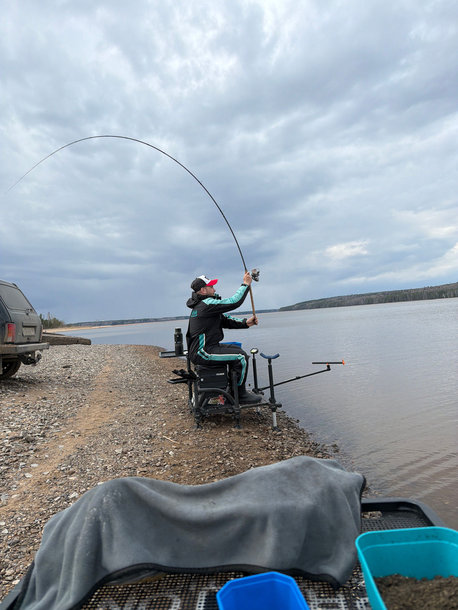 A man in a black and turquoise jacket and a red and white hat is fishing on the shoreline of a body of water under a cloudy sky. He is seated in a specialized fishing chair with attached accessories,…read more