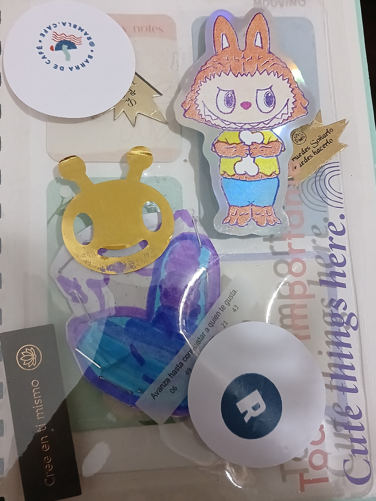 The image presents a flat lay of various decorative and functional items, including stickers, cards, and a tag, arranged under a clear plastic cover, likely part of a planner or journal. The collectio…read more
