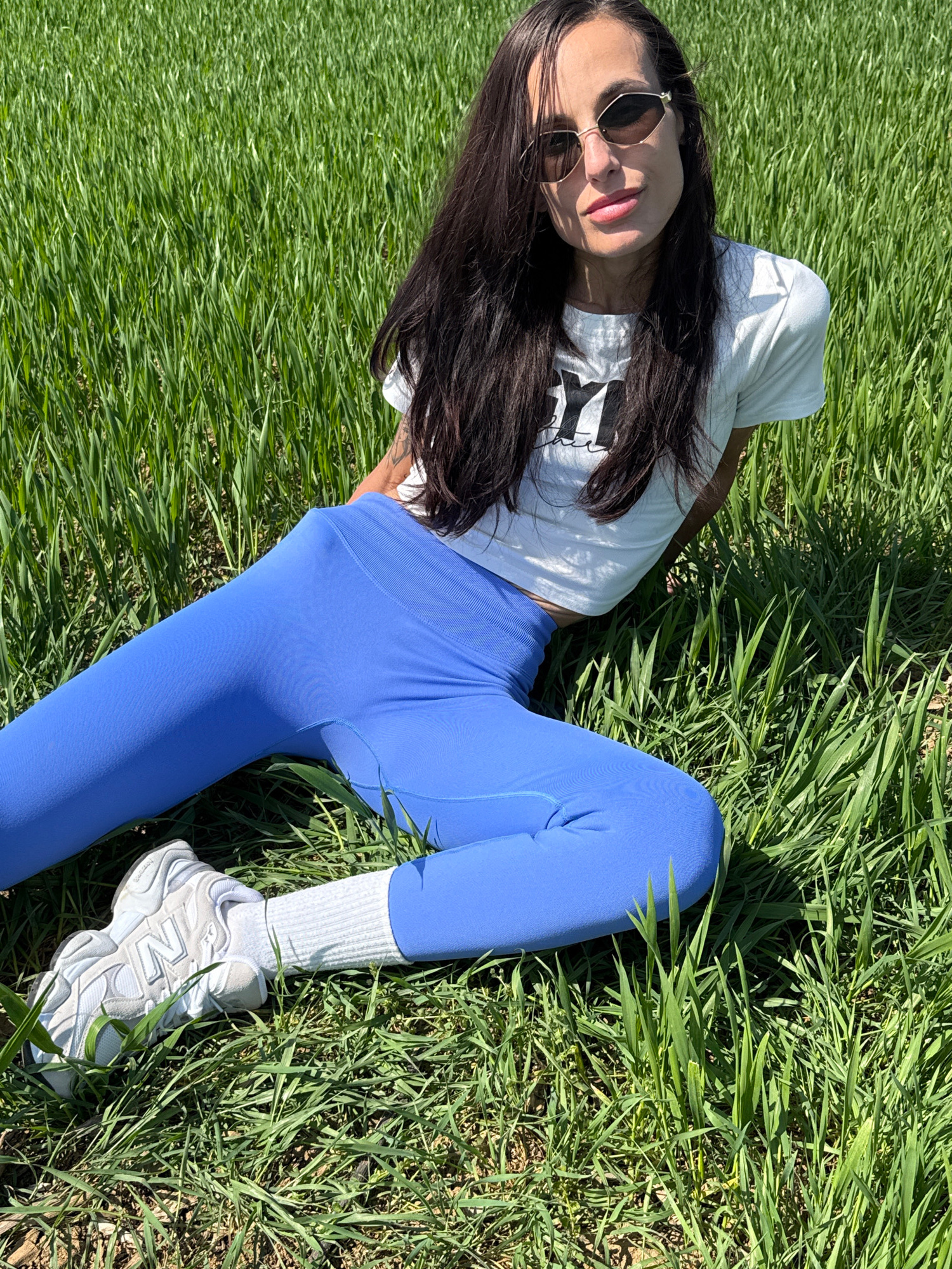 The image features a young woman lying on her back in a lush, vibrant green grass field under bright sunshine in Pleven, Bulgaria. Her body is positioned diagonally across the frame, with her head tur…read more