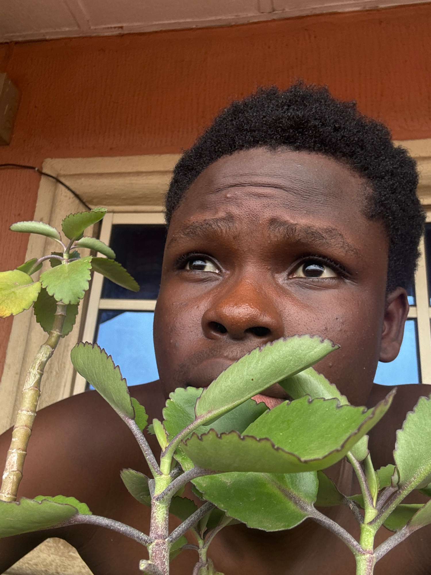 A dark-skinned man with short, dark curly hair is the main subject. He is positioned closely to the camera, partially obscured by a plant with green, scalloped leaves. His face is the focal point, wit…read more