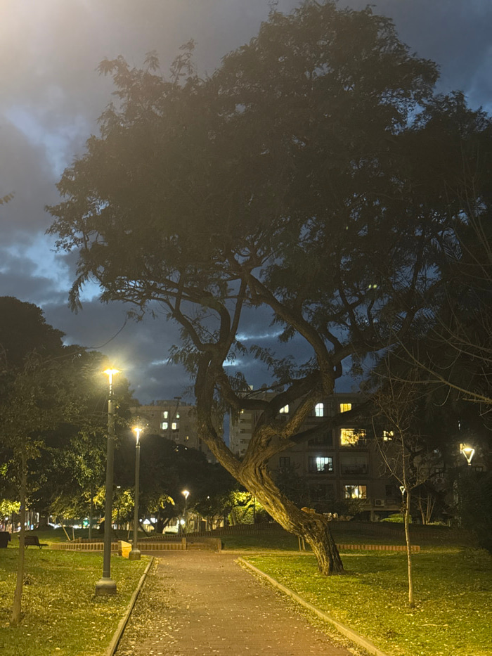 A crooked tree dominates the frame against a dimly lit park. Its branches reach out, partially obscuring a building with illuminated windows in the background. Streetlights cast a yellow glow, illumin…read more