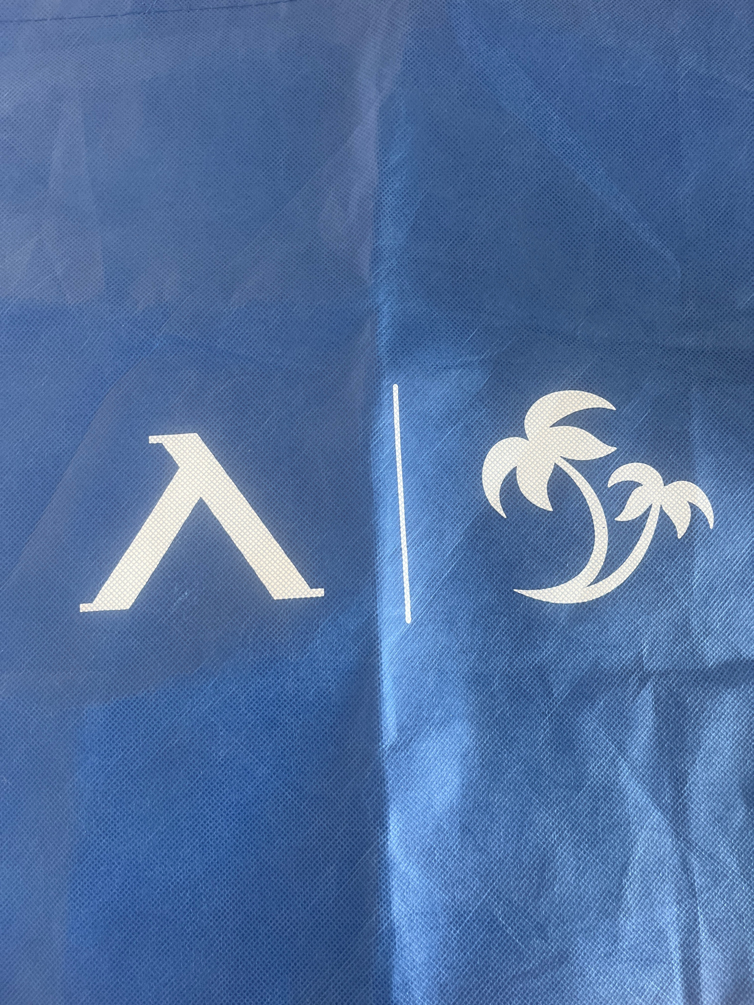 The image shows a blue reusable shopping bag with white printed designs. The top design is a stylized palm tree branch above a thin line. Below is a geometric shape resembling a "V" or an arrowhead. N…read more